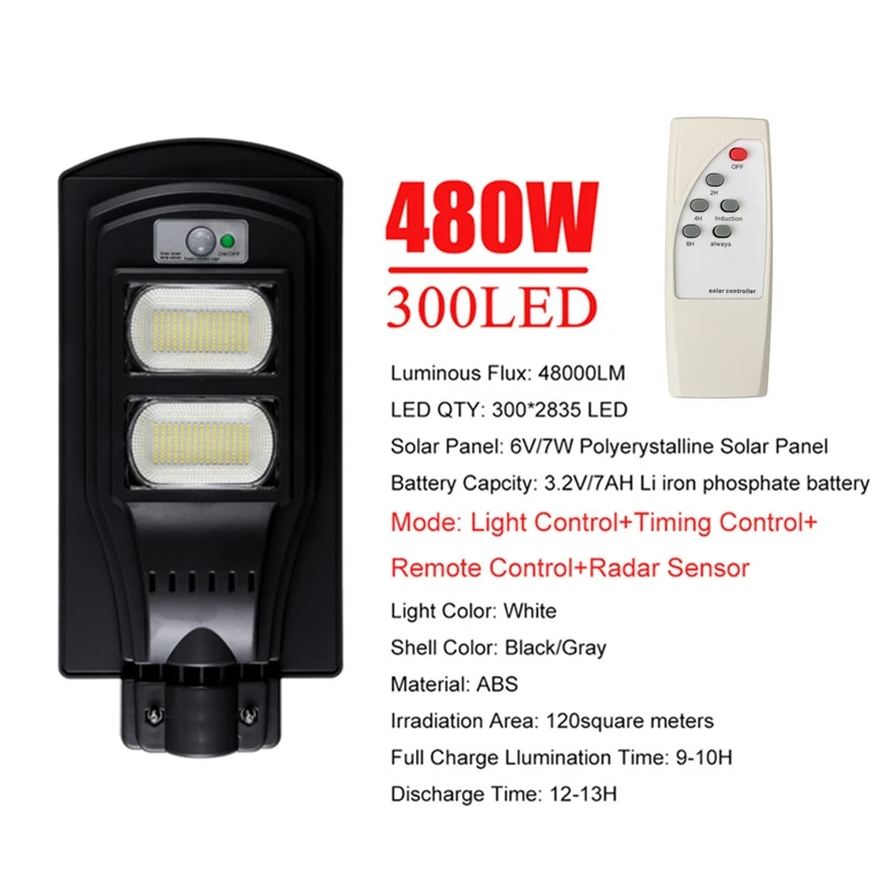 Мощность: 480 ВтСветовой поток: 48лмСветодиодный Кол-во: 300*2835 СветодиодныйСолнечная панель: 6 В/7 ВтБатарея Capcity: 3,2 V/7AH литий-железо фосфат батареяРежим: светильник + таймер + пульт дистанционного управления + радар-датчикСветильник Цвет: белыйЦвет корпуса: черныйМатериал: АБС-пластикПлощадь облучения: 120 квадратных метровВремя полного заряда: 9-10 чВремя разряда: 12-13 ч