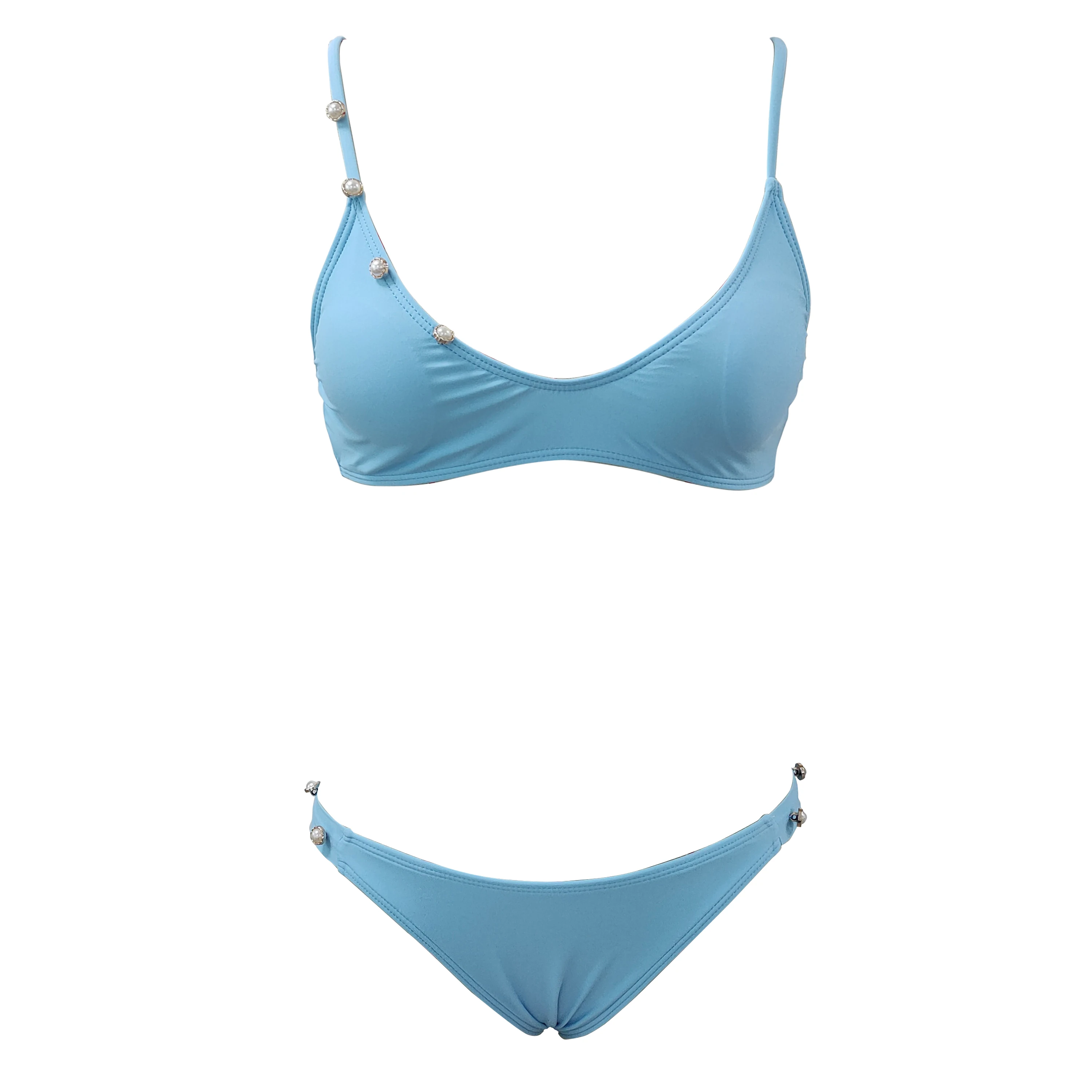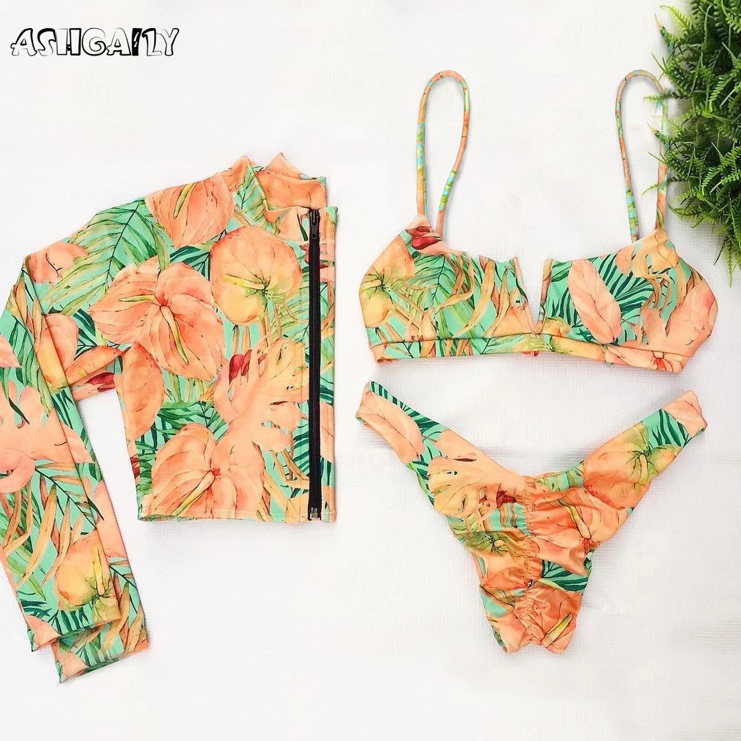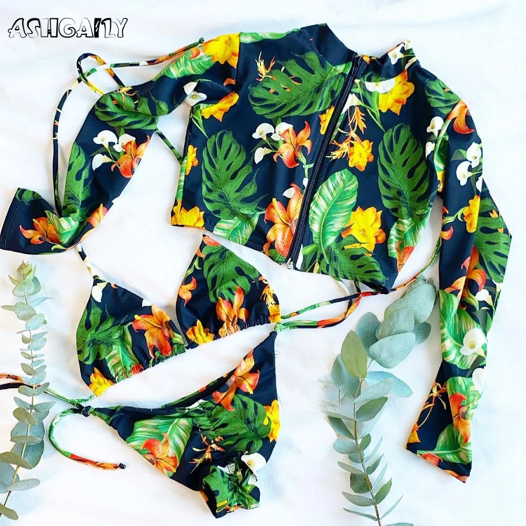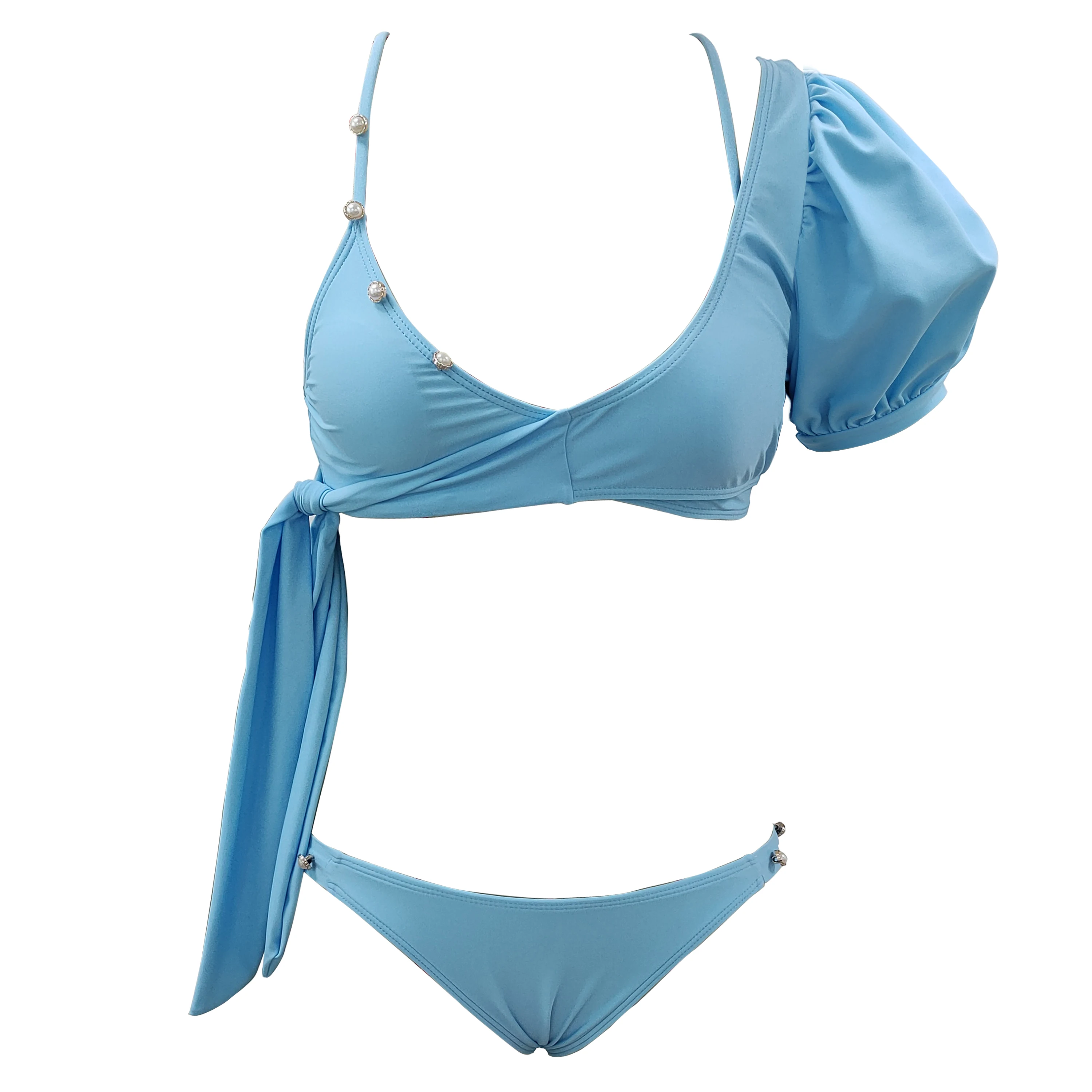 Новинка 2022, купальник, Женский комплект бикини из 3 предметов, бикини с длинным рукавом и жемчугом, пляжная одежда, женский купальный костюм, однотонное бикини с перекрестными лямками