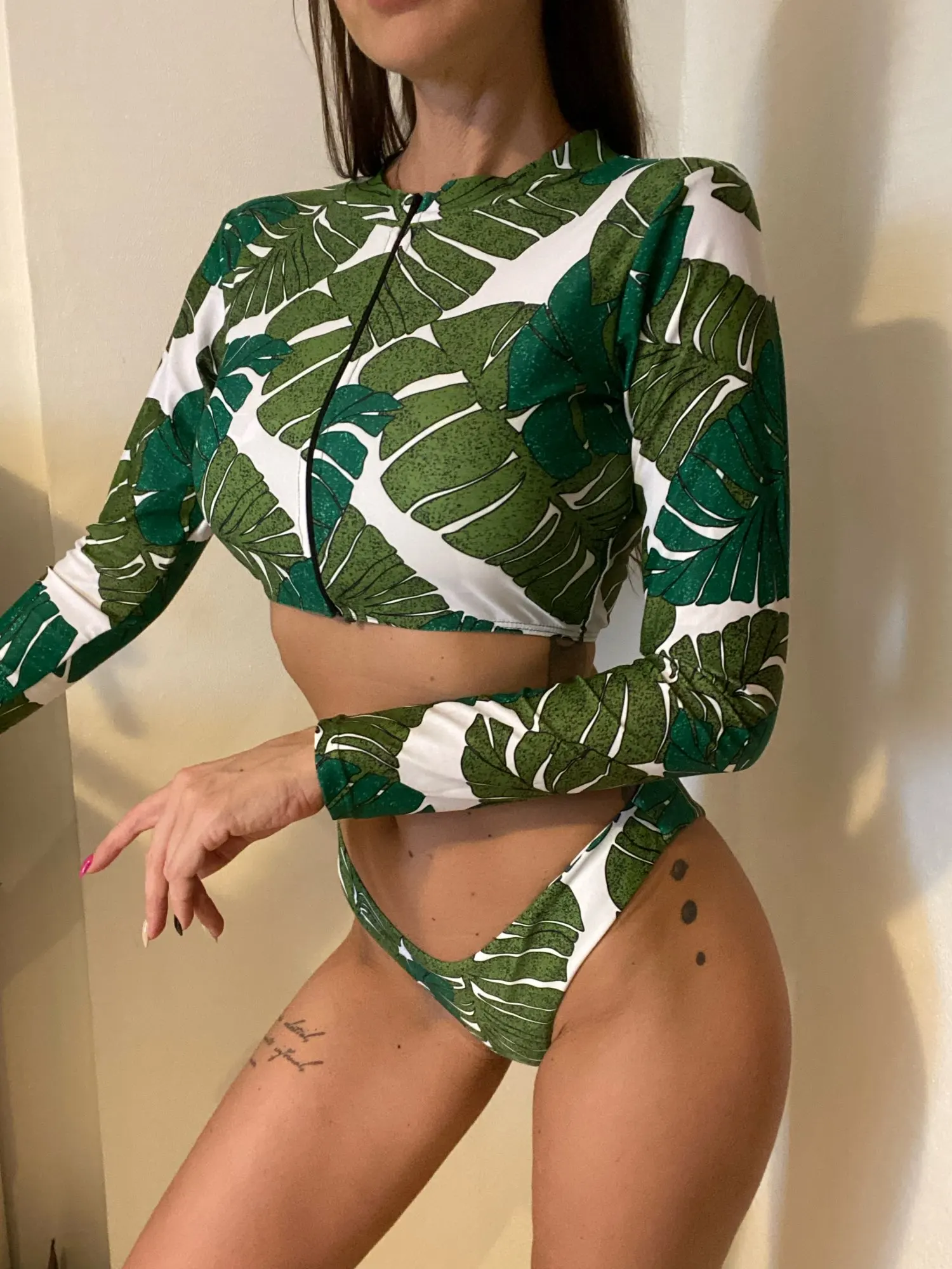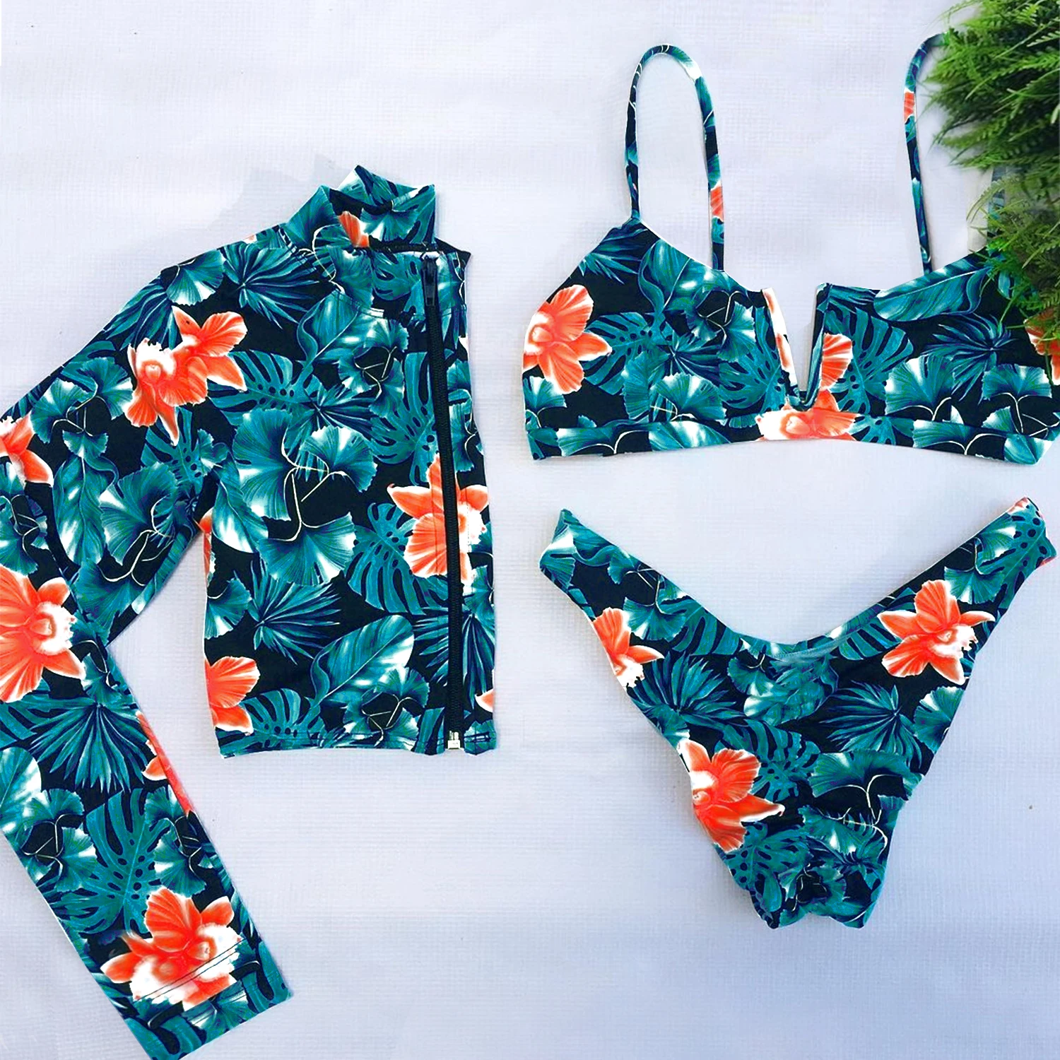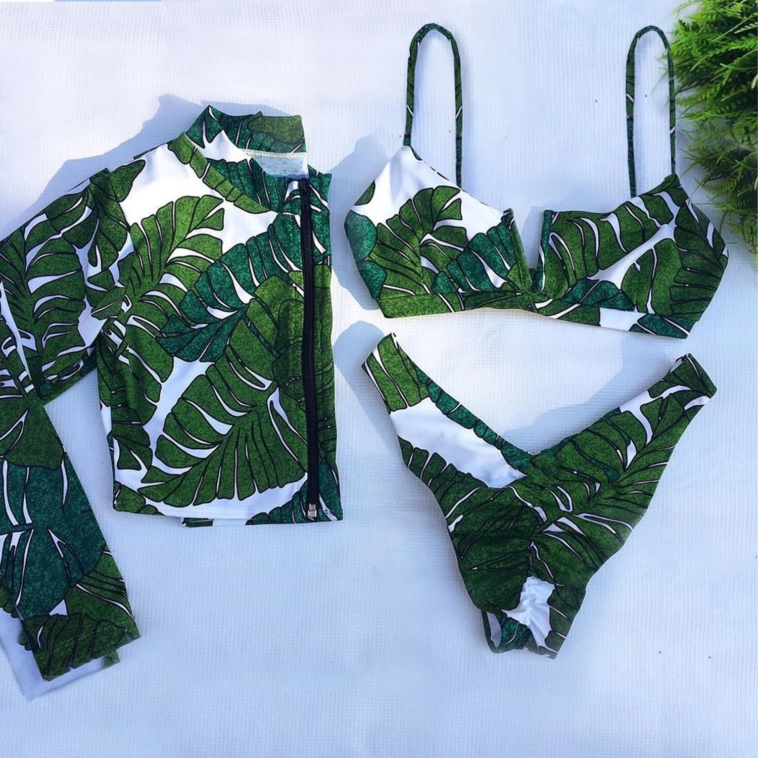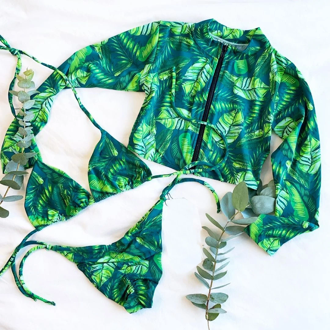 Невероятно стильный купальник тройка , включает в себя бикини и лонгслив на молнии, расцветка очень красивая , грудь браллет топ держит хорошо , брители регулируются , для груди имеются поролоновые вставки , при желании можно вынуть , купальник смотрится дорого , ткань эластичная , на параметры 85-60-94 и рост 168 размер М сел идеально, до Новосибирской области посылка шла около трёх недель, продавца рекомендую однозначно