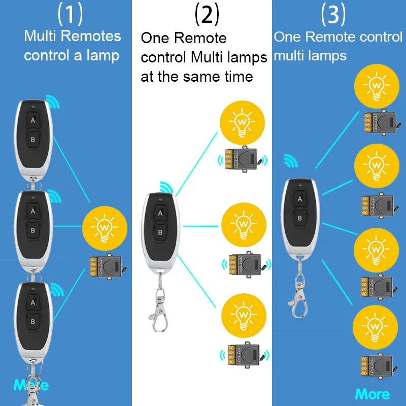 Режимы работы Мгновенный режим: Нажмите кнопку «A», реле будет работать; Realse «A» Кнопка, это реле остановится. Режим переключения: Нажмите кнопку «A», реле будет работать; Нажмите кнопку «A», это реле остановится. Режим блокировки: Нажмите кнопку «A», реле будет работать; Нажмите кнопку «B», это реле остановится. Как настроить Мгновенный режим: Нажмите кнопку обучения 1Время, Нажмите кнопку «A» один раз, добиться успеха. Режим переключения: Нажмите кнопку обучения 2Время, Нажмите кнопку «A» один раз, добиться успеха. Режим блокировки: Нажмите кнопку обучения3 раза, Нажмите кнопку «A» один раз, нажмите кнопку «B» один раз, добиться успеха. Чистые данные: Нажмите кнопку обучения8 раз, Данные будут очищены. Все пульты не могут контролировать этот приемник.