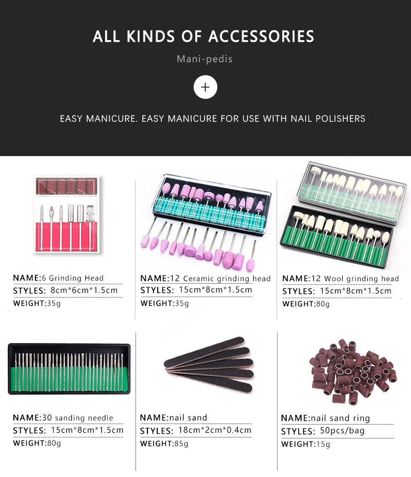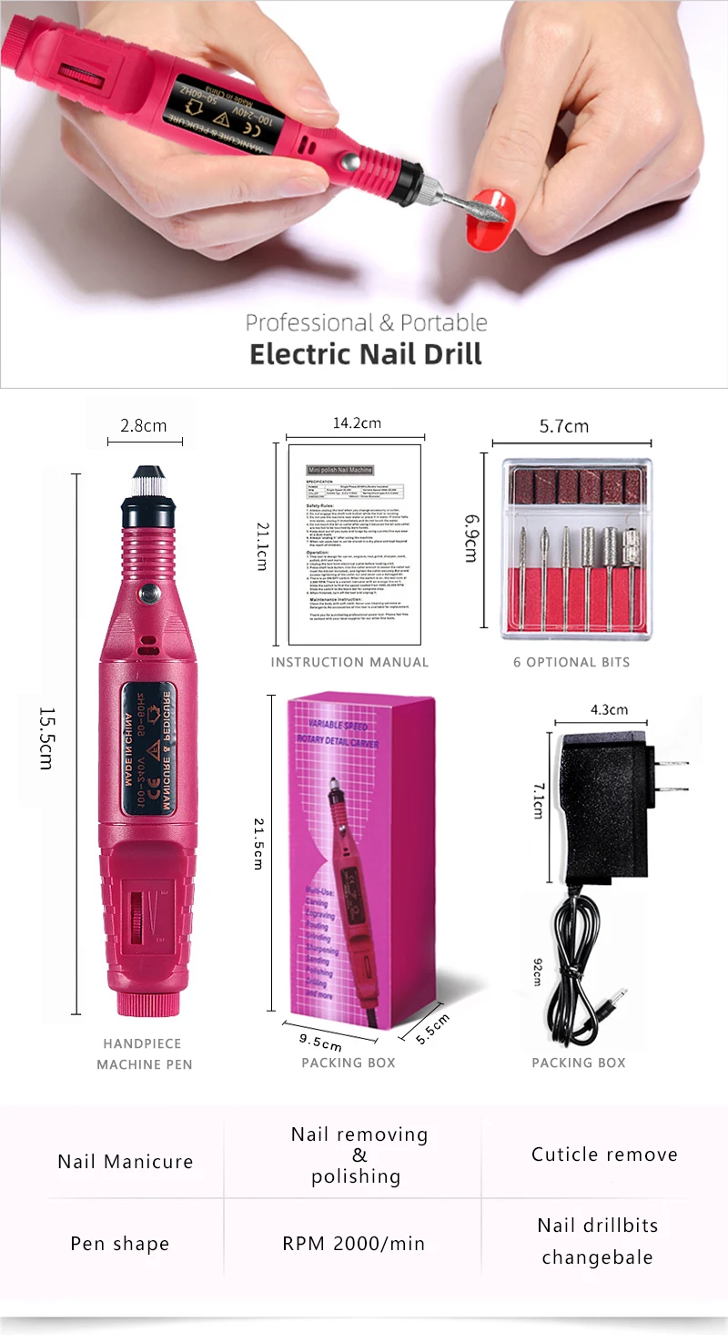 Набор 20000 ОБ/минВес посылка: 160 гНапряжение: 110 В ~ 240 ВВилка: США/ЕС/Великобритания/АвстралияРазмер основной машины: 160*24 (мм)Длина провода: около 90 смСкорость: 0-20000 ОБ/минПримечание: Мы отправим подходящий штекер в соответствии с вашей странойОсобенности1. Портативный мини-набор для ногтей, легко носить с собой.2. Подходит для профессионального использования, маникюрного салона или домашнего использования.3. Автоматическая система защиты от перегрузки.4. Тяжелая ручка для удобного захвата.5. Для повседневного ухода за телом этот набор для маникюра и педикюра станет идеальным помощником.6. С помощью этих устройств выполняйте педикюр и маникюр совершенно и элегантно.Посылка входит:На ваш выбор фото