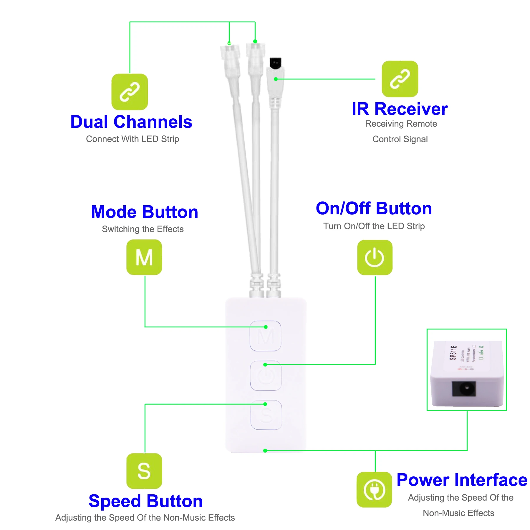 Таймер, включение/выключение светодиодный полосы на каждый день. Удаленное управление, вы можете управлять светодиодный полоской, когда и где угодно через приложение в 2G/3G/4G/WIFI сети. Отметьте, вы можете отметить эффект освещения, который вам нравится. Автоматическая игра fuction, вы можете установить приложение автоматическая петля играть чеканка светового эффекта. Режим STA, одно приложение может управлять множеством контроллеров, убедитесь, что контроллер подключен к домашней сети Wi-Fi 2,4G. Настройте светодиодный RGB-полосу.