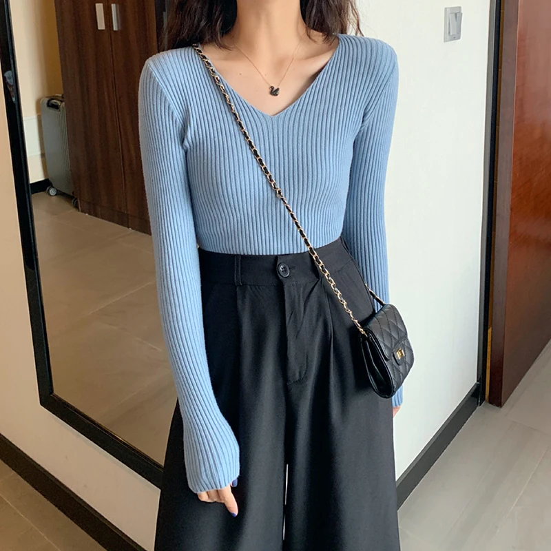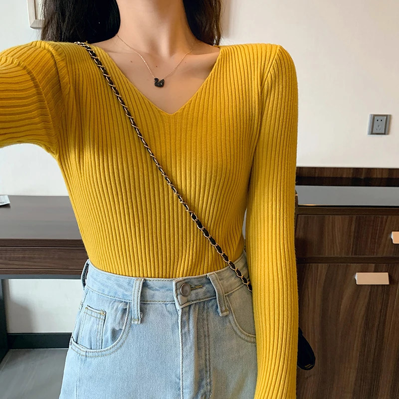 Новинка 2022, Женский облегающий пуловер с V-образным вырезом на ос...