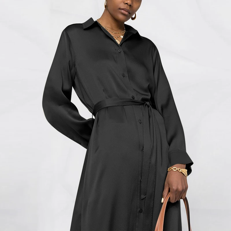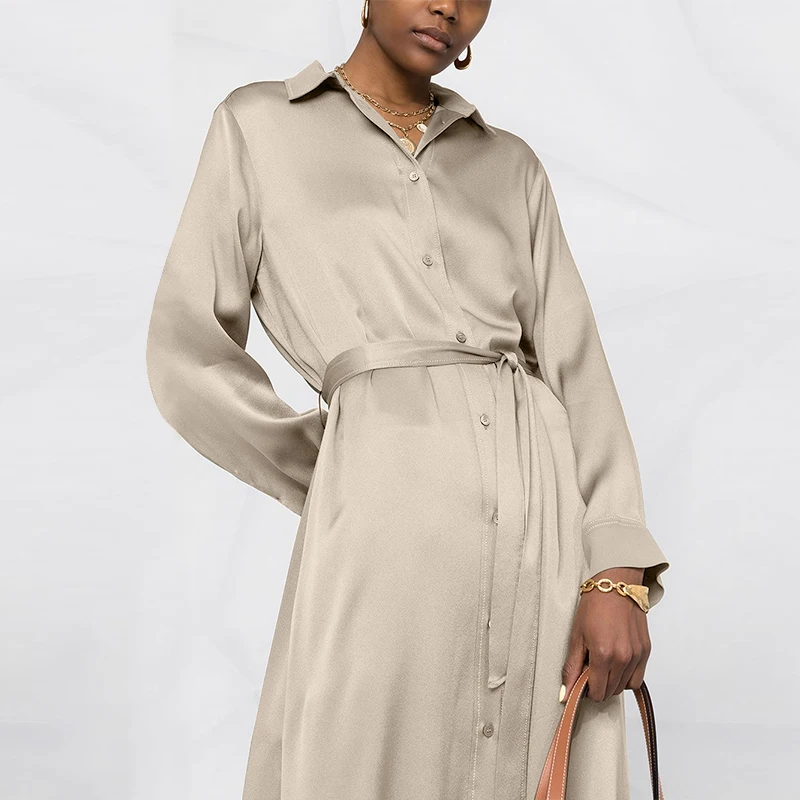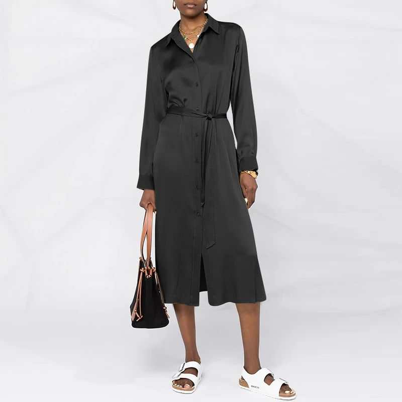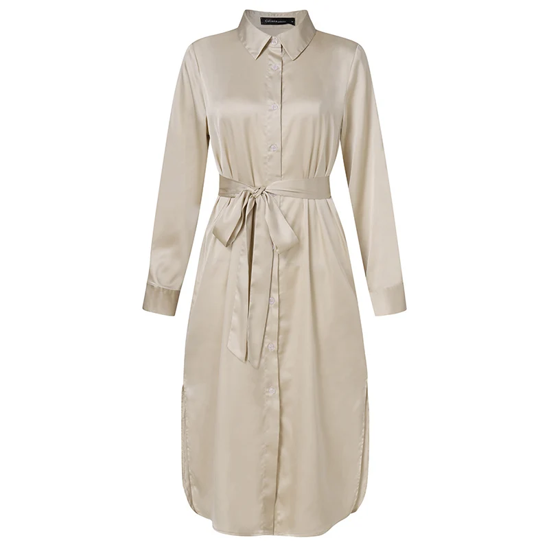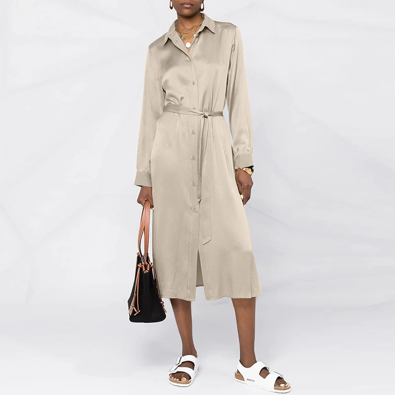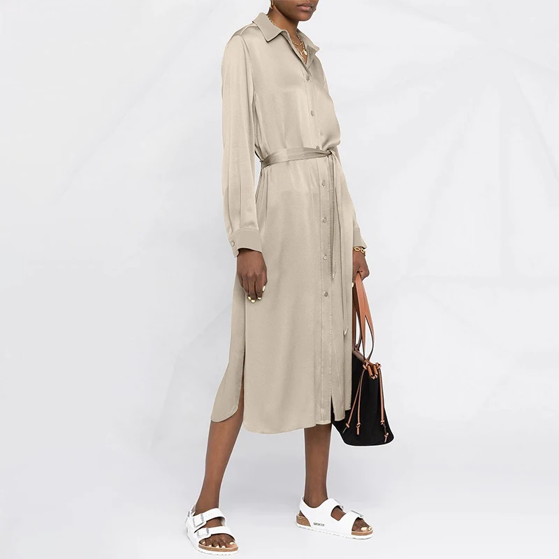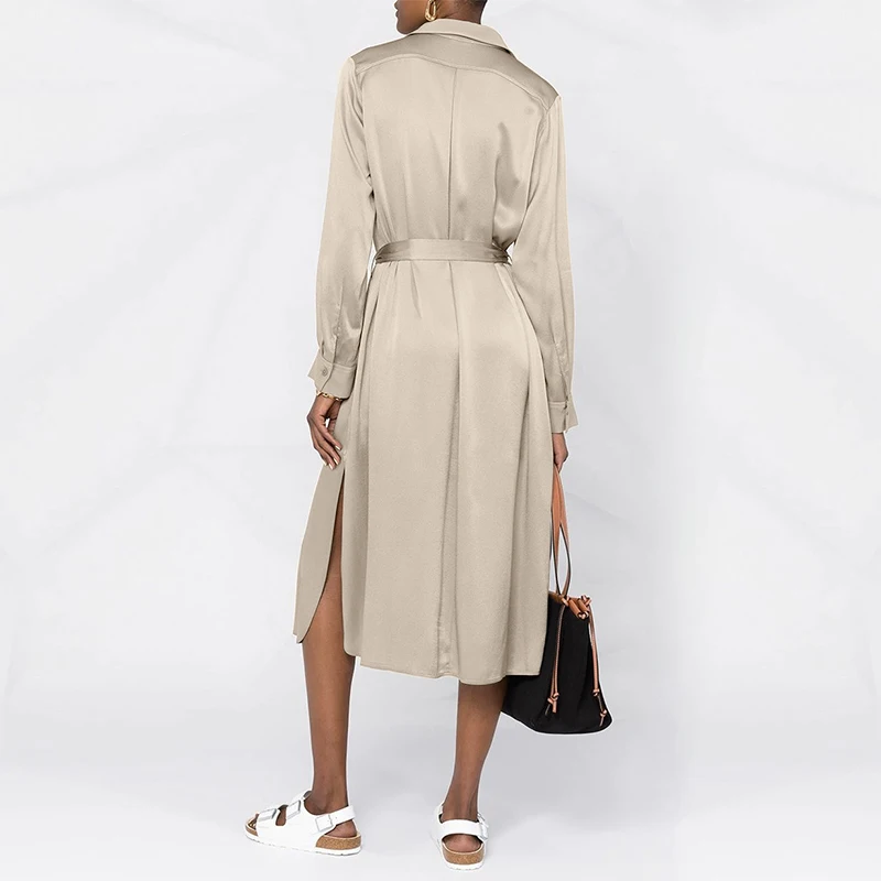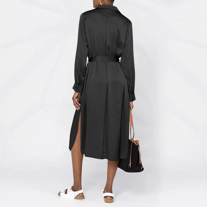 FeaturesSatin dress, Shirt dress, Split hem, Smooth, Bandage