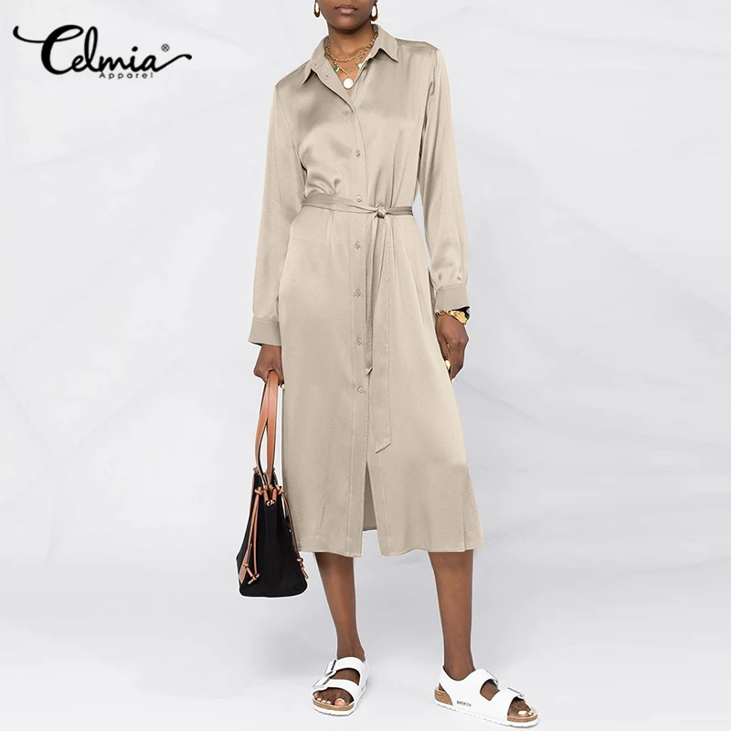 Celmia 2022 летнее женское легкое атласное платье миди с поясом, Повседневное платье-рубашка с длинным рукавом, Летние Элегантные платья с отворотом и разрезом
