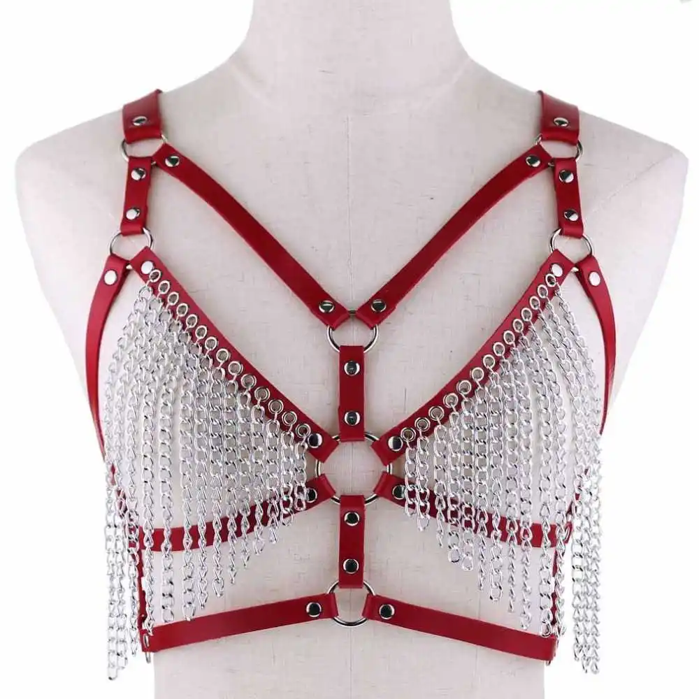 Кожаный бюстгальтер на металлической цепочке, бондажное белье, ремн...