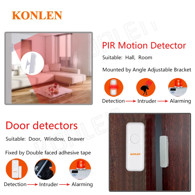 Перед использованием, пожалуйста, убедитесь, что выключатель питания датчиков движения PIR включен. Высота установки составляет около 2,2 метров над уровнем земли.Когда воры проходят через Область обнаружения, PIR детектор активируется для передачи беспроводного сигнала на панель сигнализации. Тревожная система.Магнитный дверной датчик окна двери:Дверной датчик используется для обнаружения закрывания и открытия двери, и состоит из передатчика и магнита двух частей. Его можно установить на двери, окна или любой предмет, который можно закрыть и открыть. Когда передатчик отделен от магнита, датчик двери отправит сигнал тревоги на панель сигнализации, система сигнализации будет оповещать.