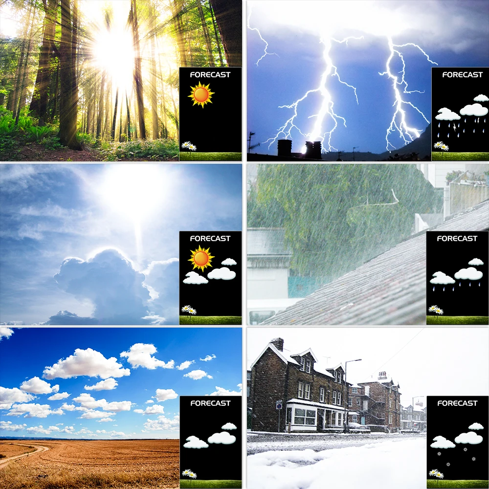 8. Прогноз погоды с использованием шести иконок: солнечный, слегка облачный, облачный, дождливый, сильный дождливый и зимний