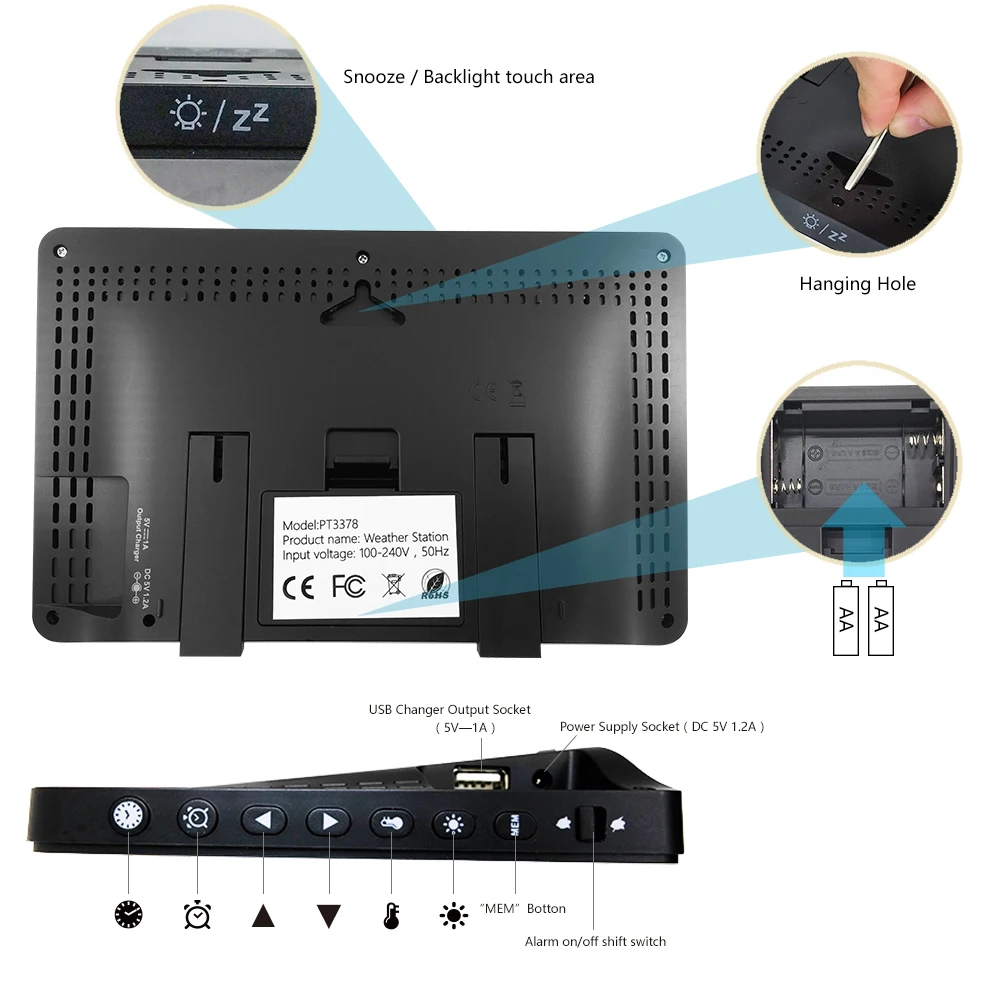 Погодная станция:Батарея: 2 x Размер 1,5 V AA (не входит в комплект)DC-POWER: DC5V 1.2A (в комплекте выберите адаптер в соответствии с вашими требованиями к региону.)Беспроводной наружный Датчик:Батарея: 2 x Размер 1,5 V AA (не входит в комплект)Размер дисплея: 165x92 мм