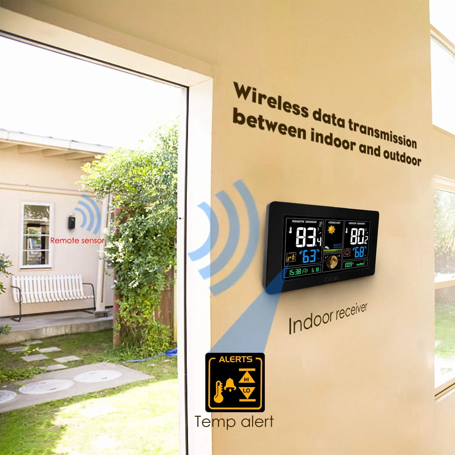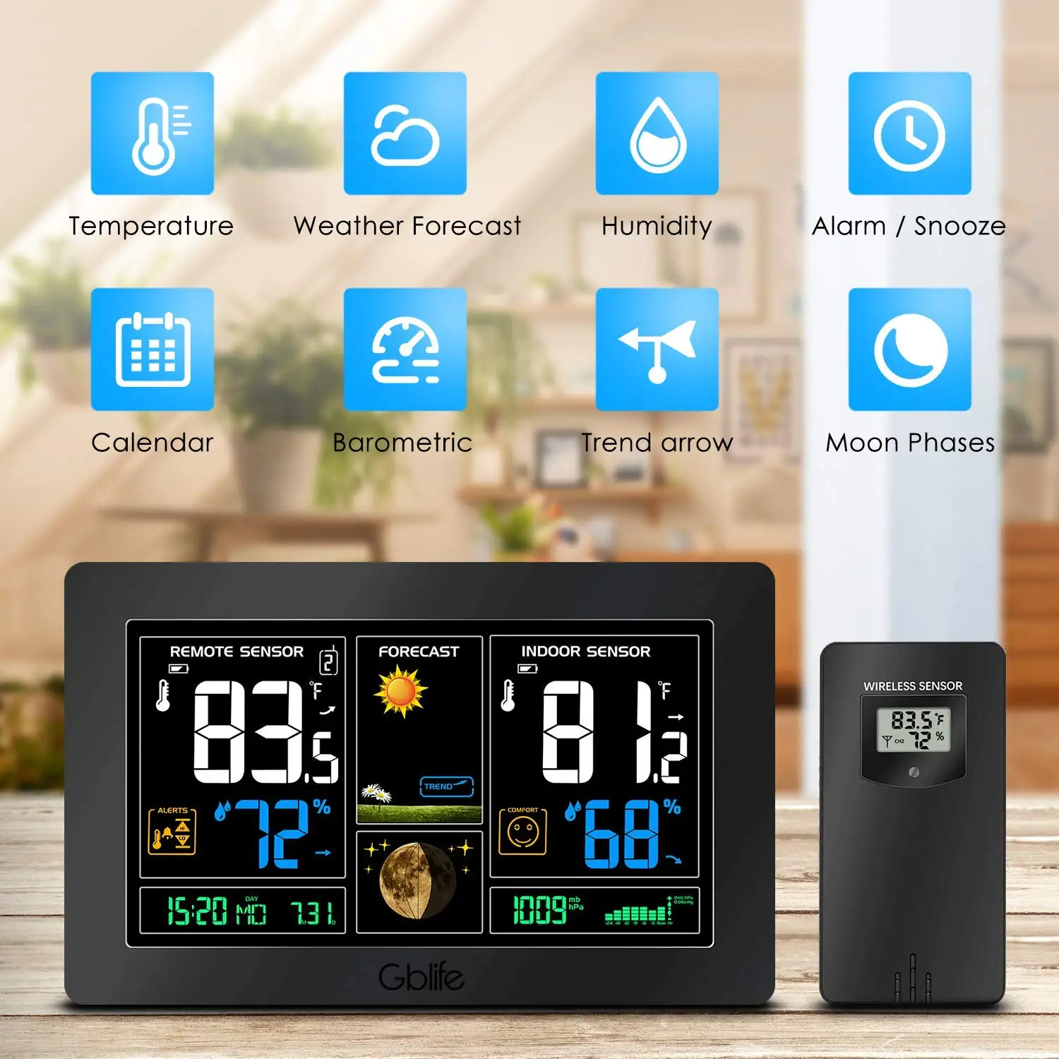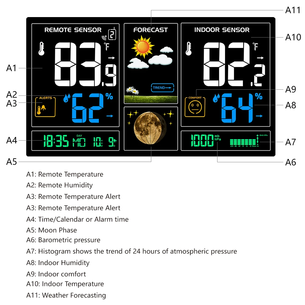 Внутренний/наружный дисплей температуры и влажности в опциональном °C или °F.Минимальный/максимальный дисплей для влажности воздуха и температуры. Отображение тренда давления воздуха; На улице появится символ оповещения о льде и сигнал тревоги, когда наружная температура от 30 °F до 37 °F;Отображение влажности и температуры в помещении