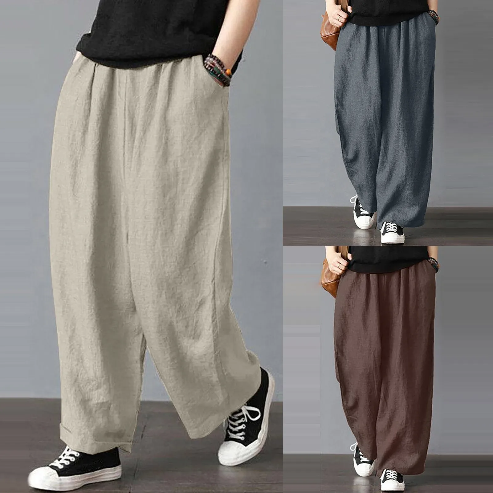 Брюки женские повседневные из хлопка и льна, свободные прямые штаны...