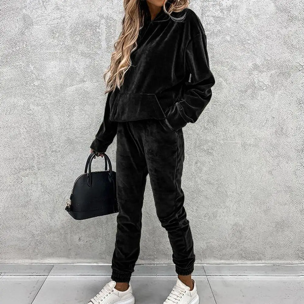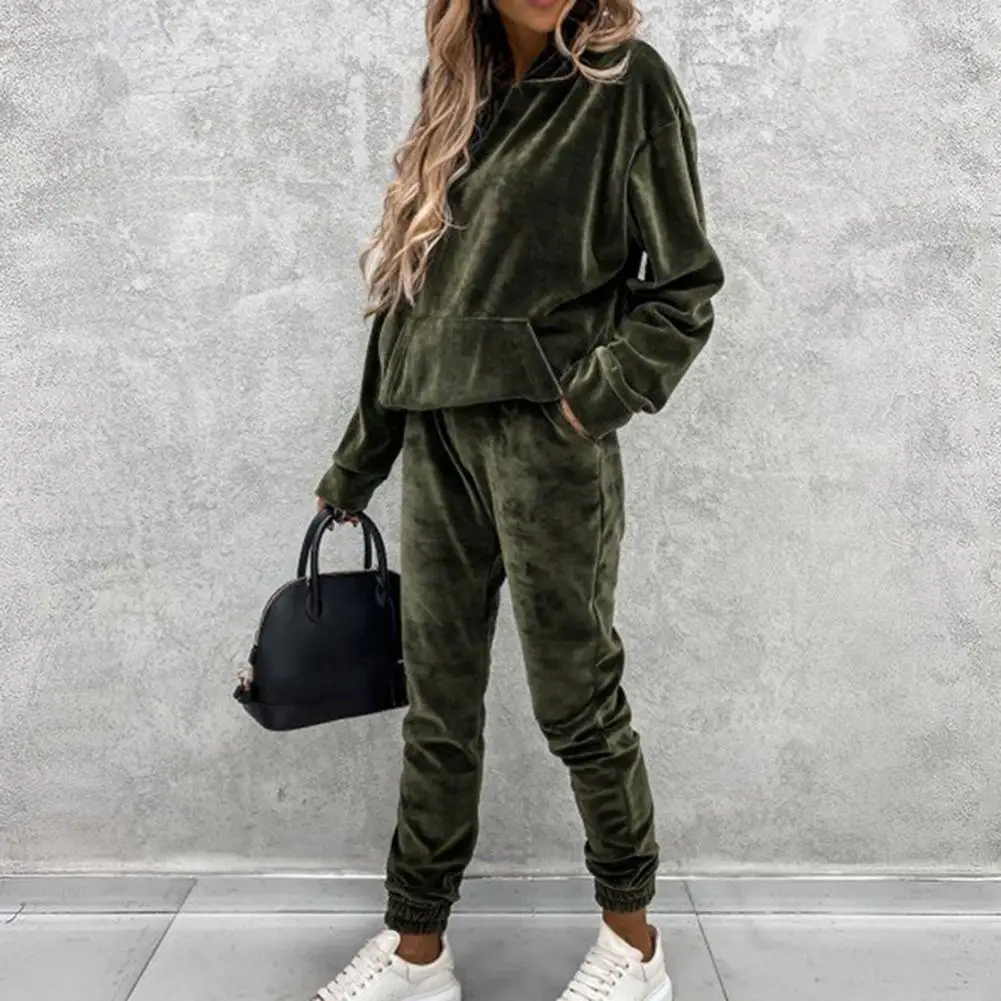 Костюм спортивный женский, бархатный, однотонный, с длинным рукавом и карманами
