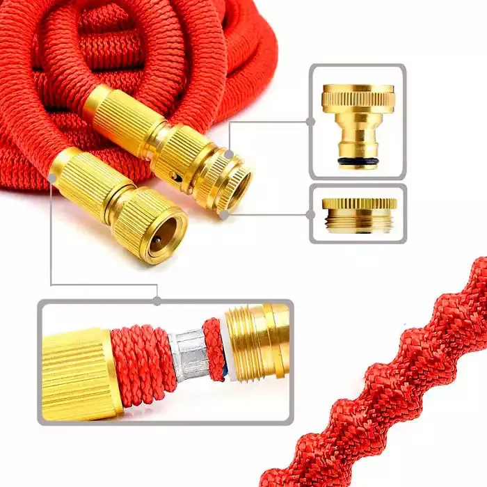 Волшебный садовый шланг изготовлен из прочных износостойких материалов, состоит из внутреннего жесткого резинового шланга с твердым и внешним нейлоновым покрытием. Эта конструкция позволяет шлангу растягиваться до трех раз от исходного размера под давлением воды. Это количество воды обеспечивает минимальный период орошения на большую площадь, чем при поливе обычным шлангом, а мощное давление позволяет легко удалить грязь и муку.