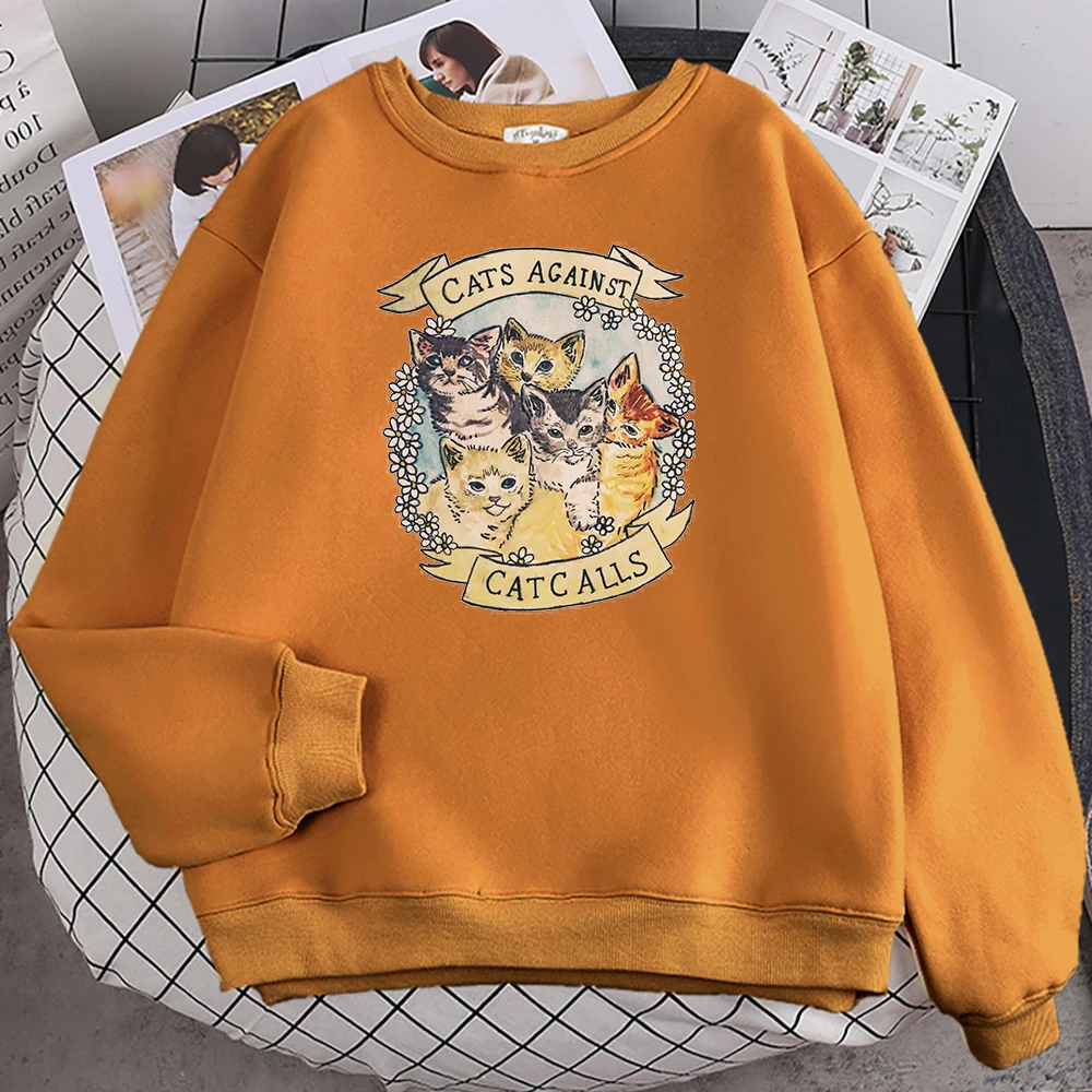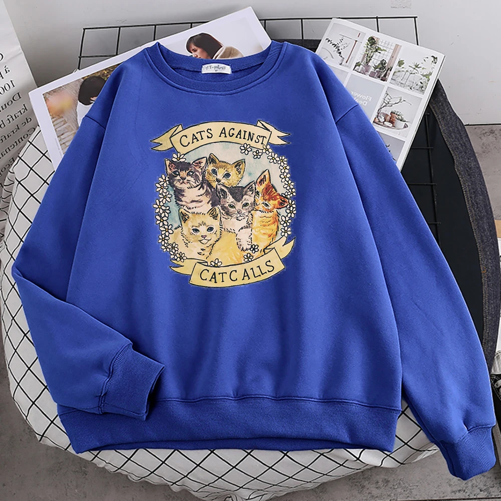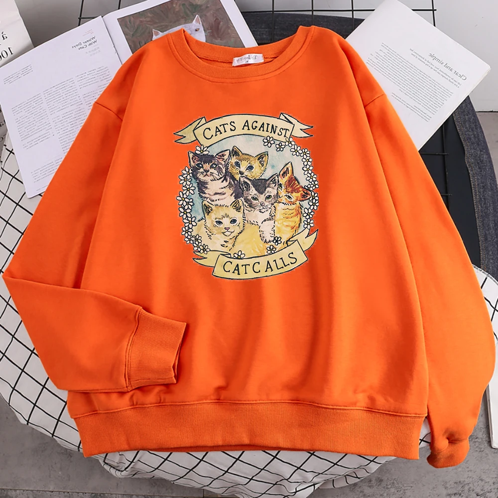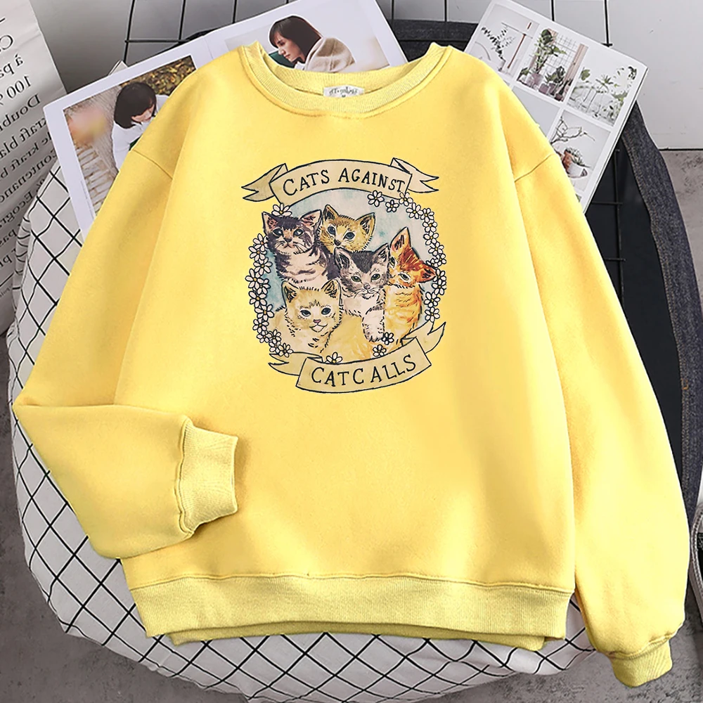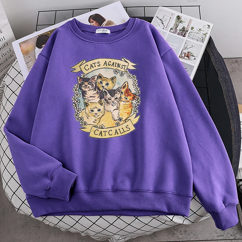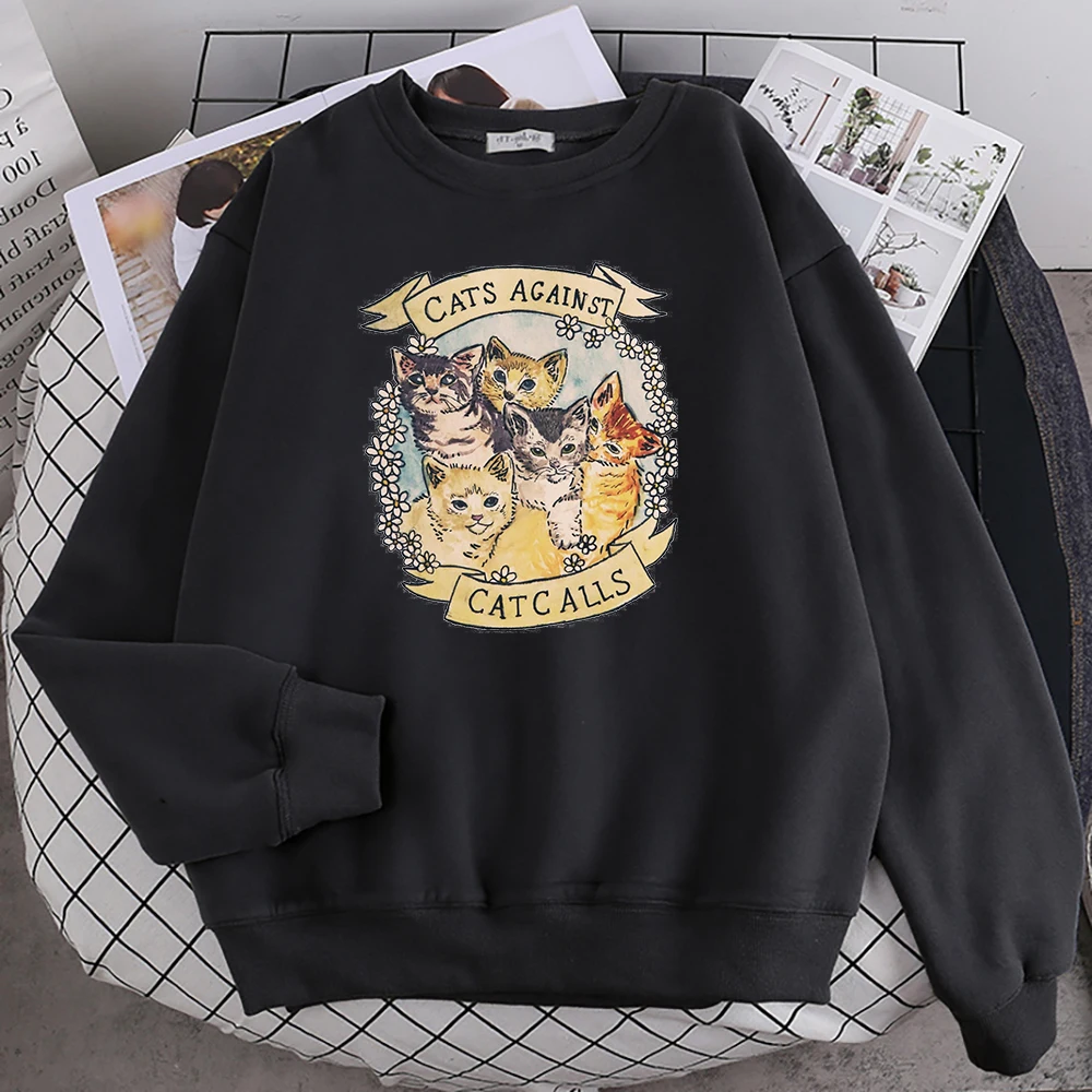 Женские толстовки с принтом Cat Against The League, модные повседневные теплые толстовки, осенняя свободная флисовая толстовка с капюшоном, простой пуловер большого размера для женщин