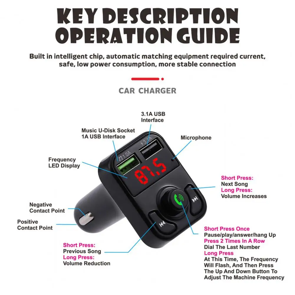 Передатчик hands-free dual USB быстрая зарядка Bluetooth 5.0 светодиодный дисплей Автомобильный MP3-плеер для автомобиля зарядка в прикольном состоянииОписание:Светодиодный дисплей может четко отображать частоту FM. Разработанный с Bluetooth громкой связью, он может принести удобный и безопасный вызов для вас.Он поддерживает u-диск/tf-карту/телефонную музыку или воспроизведение аудио, чтобы вы могли наслаждаться музыкой во время вождения по дороге.Он изготовлен из АБС-пластика, который является прочным в использовании. Благодаря технологии Bluetooth A2DP и функции подавления эха DSP вы можете наслаждаться высококачественным стереозвуком. Интерфейс USB используется для зарядки различных мобильных телефонов.Длина этого продукта составляет 8,5 см, ширина-5 см, а высота 3,6 см.Наш продукт принимает 12V-24V с большим числом значений напряжения питания, так что он подходит для большинства автомобилей. Встроенный fm-передатчик, MP3 декодирование и стерео Bluetooth беспроводной чип передачи.Наименование товара: fm-передатчикМатериал: АБС-пластикНоминальное рабочее напряжение: 12 ~ 24 ВUsb-выход для быстрой зарядки: 5 В/3,1 АРасход: 0,5 WПротокол Bluetooth: Поддержка HFP/HSP, OPP, A2DP/AVRCP, PBAPВерсия Bluetooth: 5,0 + EDRРасстояние передачи Bluetooth: 10 ~ 15 мЧастотная характеристика: 20 Гц ~ 15 кГцЧастота передачи FM: 87,5 ~ 108 МГцФормат аудио: MP3Отношение сигнал-шум: -68 дБРабочая температура: 0 градусов Цельсия ~ 90 градусов ЦельсияХарактеристики: Hands-free, Dual USB, MiniИнформация о размере:8,5 см х 5 см х 3,6 см/3,35 "x 1,97" x 1,42 "(прибл.)Примечания:Благодаря светильник и экрана Цвет Товара может быть s светильник ly отличается из-за характеристик монитора компьютера.Возможны незначительные отклонения в размерах из-за различных измерений вручную.Посылка включает в себя:1 fm-передатчик