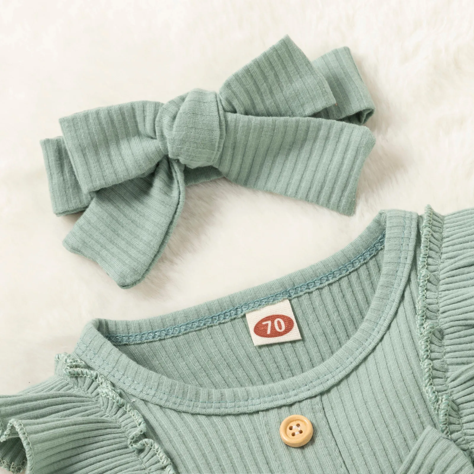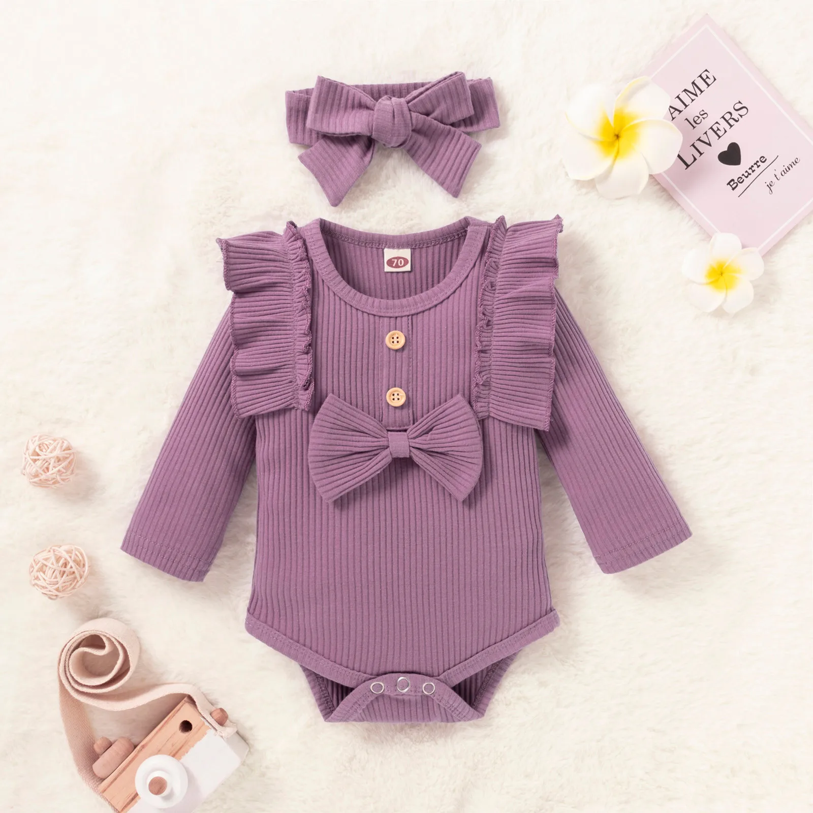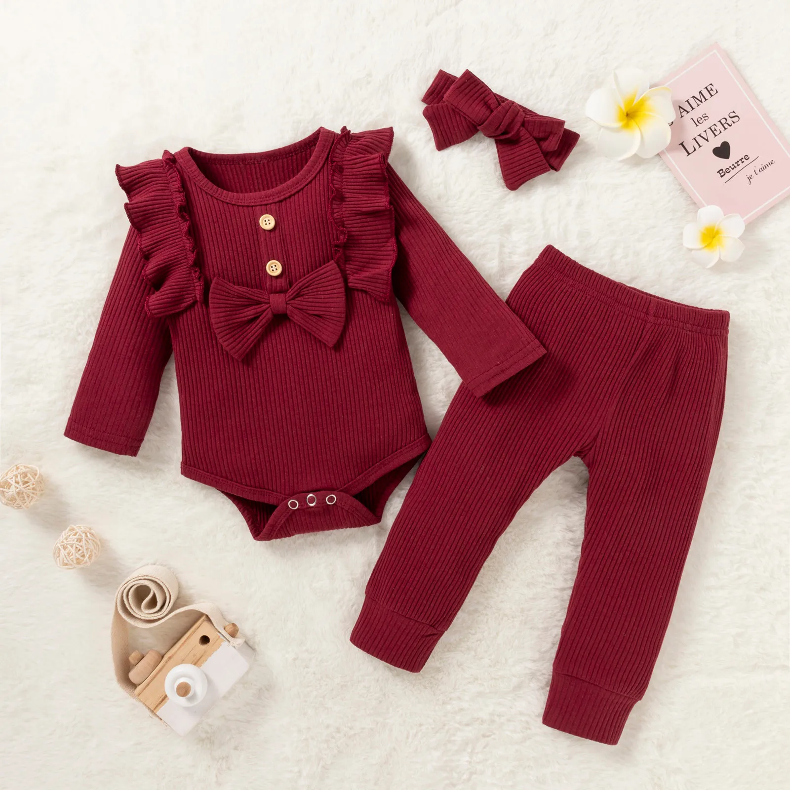 Однотонный гофрированный рифленый бантик для новорожденных девочек, комбинезон + штаны, комплект одежды