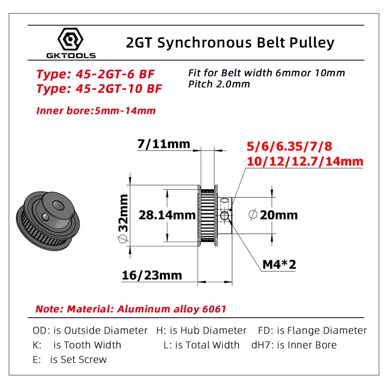 Model Number45teeth 2GT pulley bore 5mm-14mm for belt width 6mm/10mm
