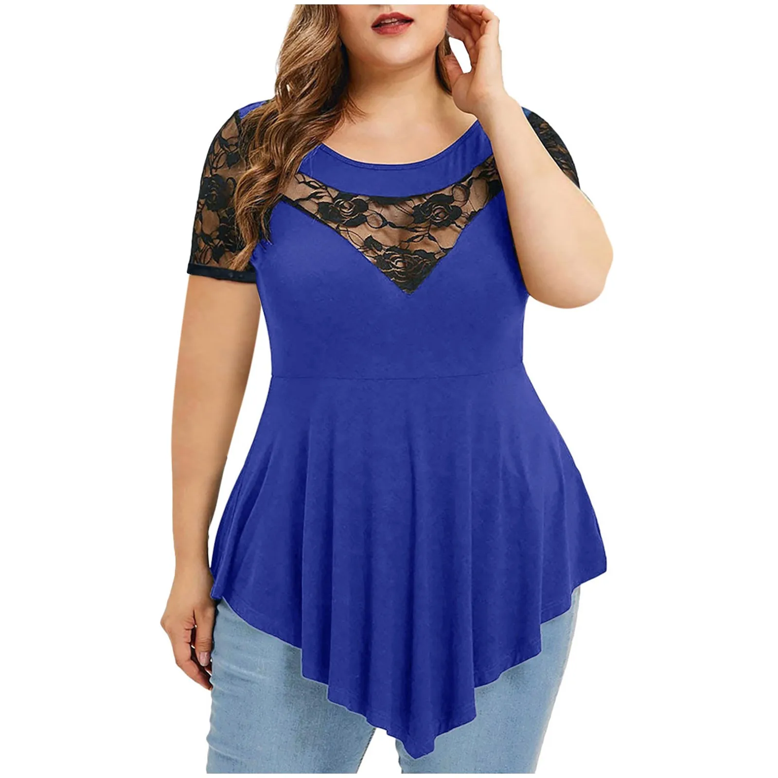 Элегантные женские кружевные топы, женская одежда, однотонная Асимметричная туника с цветочным кружевом и круглым вырезом, топы с кружевными рукавами, блузка, большие туники