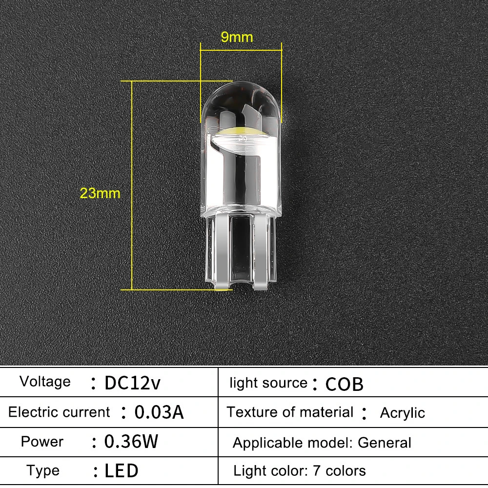 Светодиодный чип: COBТип: T10, W5W, 168 и 194Напряжение: 12 пост. ТокаЦвета: белый/кристально-синий/желтый/красный/розовый/синий/зеленыйОбщие виды применения: подсветка номерного знака, освещение салона, купольное освещение, карта освещения,Габаритные огни, задние фары, тормозные огни, противотуманные фары, сигнальные огни поворота и т. д.Подходит для мотоциклов, автомобилей, автомобилей, транспортных средств, мотовездеходов, квадроциклов, UTVs, автомобилей, грузовиков, скутеровПростота установки, plug & playПосылка включает в себя:Светодиодный фонарь 10x T10 / W5W