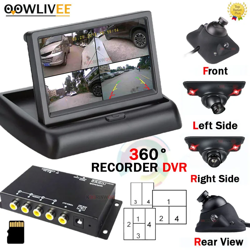 Складной ЖК-монитор OOWLIVEE, 360 дюйма, 4-канальный раздельный видеорегистратор, коробка, камера видеонаблюдения, ИК-камера переднего вида, все для 1 реального