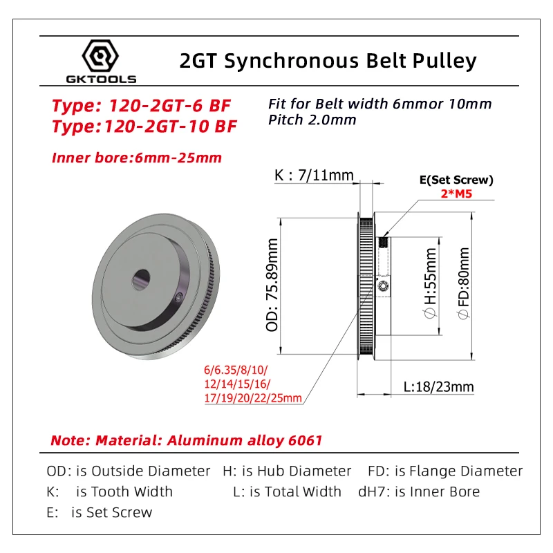 Model Number120teeth 2GT pulley bore 6mm-25mm for belt width 6mm/10mm