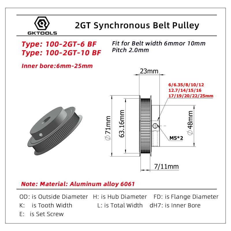 Зубчатый шкив GKTOOLS 100 зубцов 2GT, отверстие 66. Синхронный ремень GT2 шириной 358101214151619202225 мм, 610 мм, 100 зубьев, 100 T