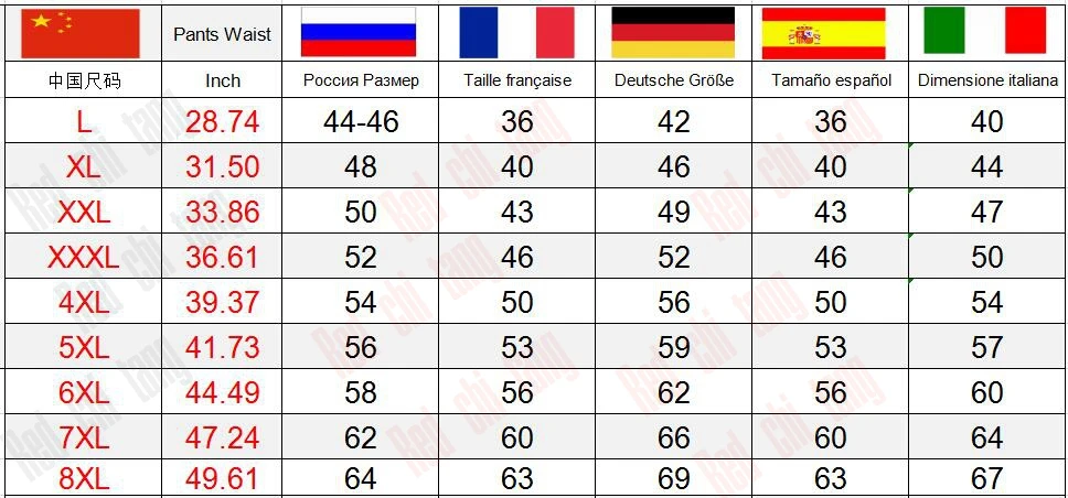 130-140Кг 286-308Lbs 126 84 70 144 1. Единица измерения: см. При размещении заказа, Пожалуйста, измерьтеРазмер брюк (не размер тела)И Красный Чи Тан строго следуйте таблице размеров, чтобы выбрать размер. 2. Измеряется вручную, может быть 2 см ~ 3 см отличается. Пожалуйста, обратите внимание при измерении. 1 см = 0,3937008 дюйма.Китайские размеры и европейские размеры брюк
