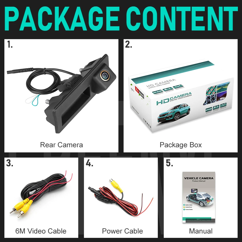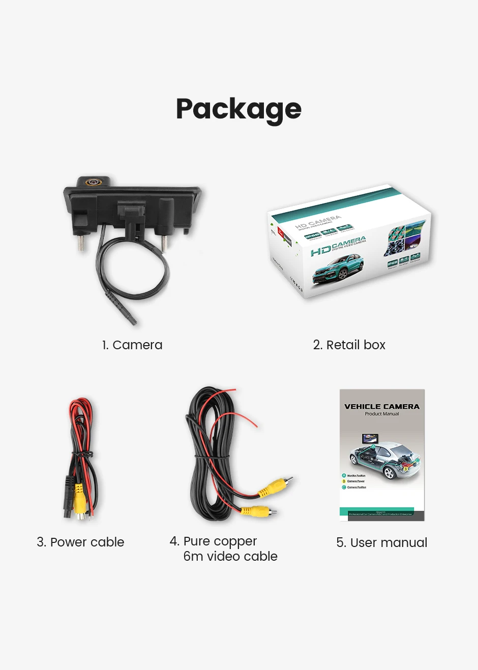 1. Камера заднего вида2. Розничная коробка3. Кабель питания4. Чистый медный 6 м видео кабель5. Руководство пользователя