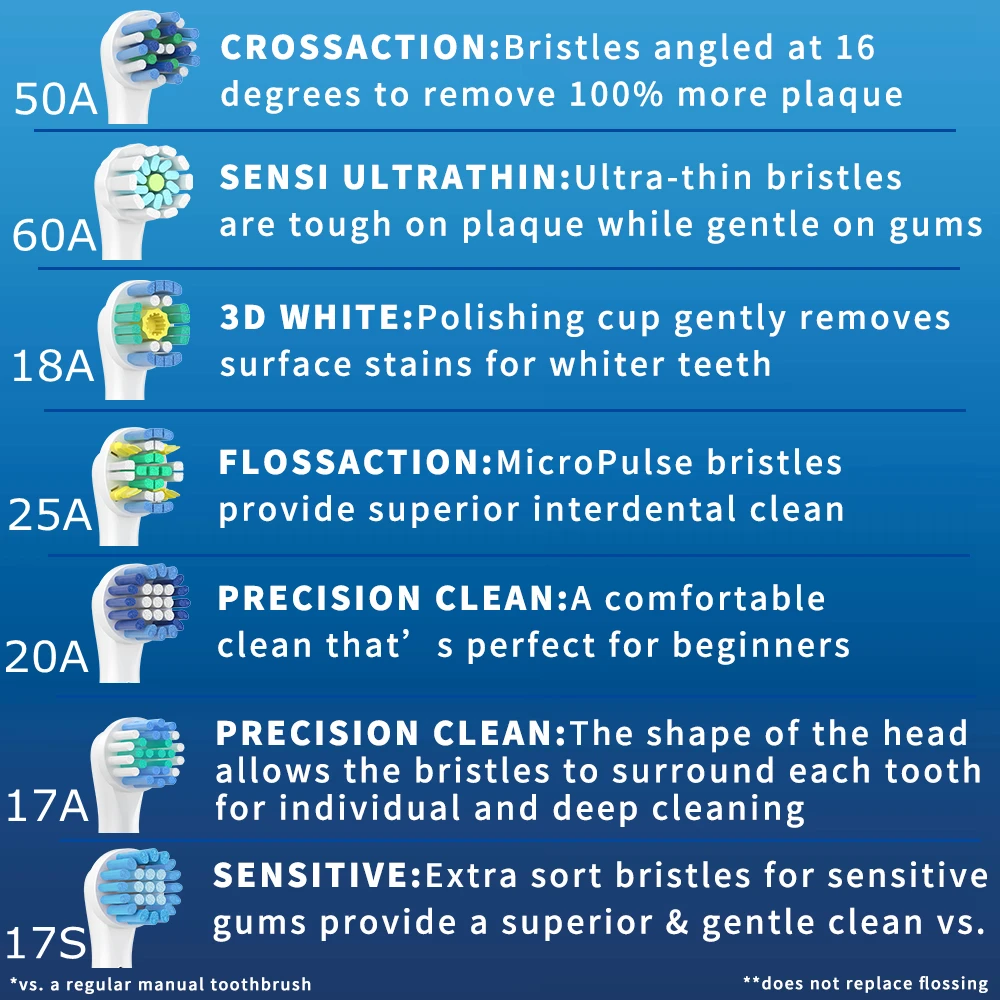 YE17A: ежедневная ЧисткаУмеренная мягкость. Подходит для ежедневной чистки нормальных зубов.YE18A: 3D БелыйСменная головка электрической зубной щетки оснащена специально разработанной полировочной чашкой, которая поможет удалить пятна на поверхности, а щетинок очистит зубной налет, что делает его идеальным для улучшенной очистки и отбеливания.YE20A: Точная ЧисткаДля чистки зубов. Удобная чистка, идеально подходит для начинающих. Специально разработана для удаления на 400% больше зубного налета по линии десен, чем ручная зубная щетка.YE25A: Действие нитиДля зубной нити, такой как Clean +. Усовершенствованная микроимпульсная щетина. Обеспечивает превосходную межзубную чистку.YE50A: перекрестное действиеУдаляет 500% больше зубного налета вдоль линии десен. Наша Самая передовая головка щетки. Идеально Угловые щетинки достигают глубины между зубами. Удаляет 500% больше зубного налета вдоль линии десен.YE60A: Чувствительная ЧисткаДля бережной очистки. Дополнительные мягкие щетинки, идеально подходят для людей с чувствительными деснами. Улучшенная чистка.