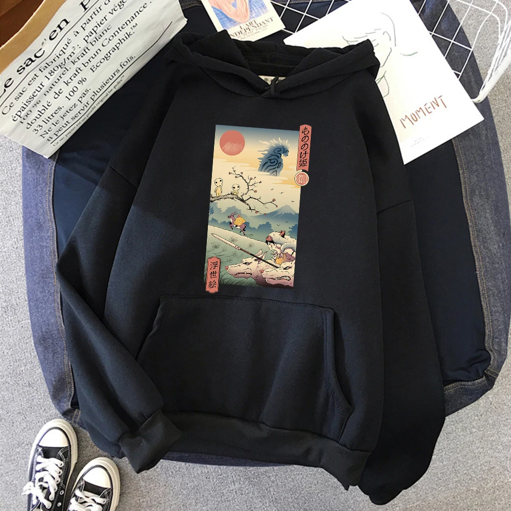 Худи мужское флисовое в стиле укиё-э, Свитшот в стиле ретро с изображением принцессы волка, милая креативная уличная мода, теплая кофта