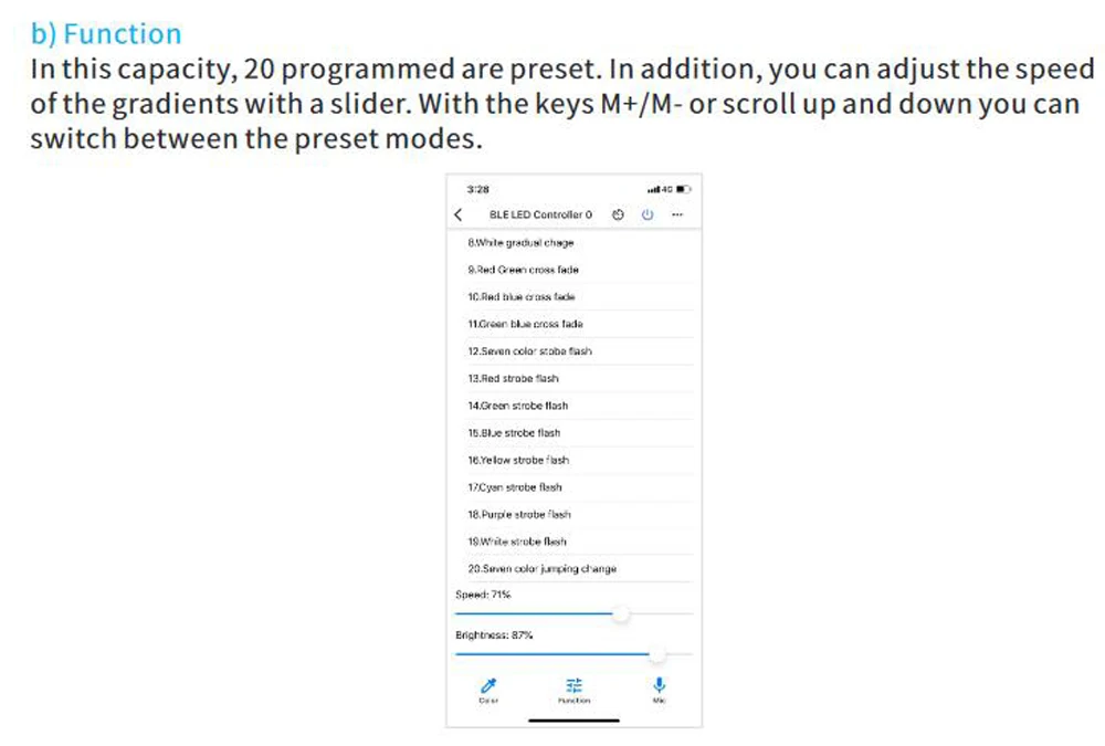 (3) это умное устройство непосредственно контролирует включение и выключение светильник, регулирует цвет и яркость светильник, а также регулирует различные красивые эффекты светильник, такие как 1, изменение цветного градиента, различные монохромные, двухцветные градиентные изменения, все виды монохромных, двухцветные, красочные стробоскопы, красочная вспышка и так далее.