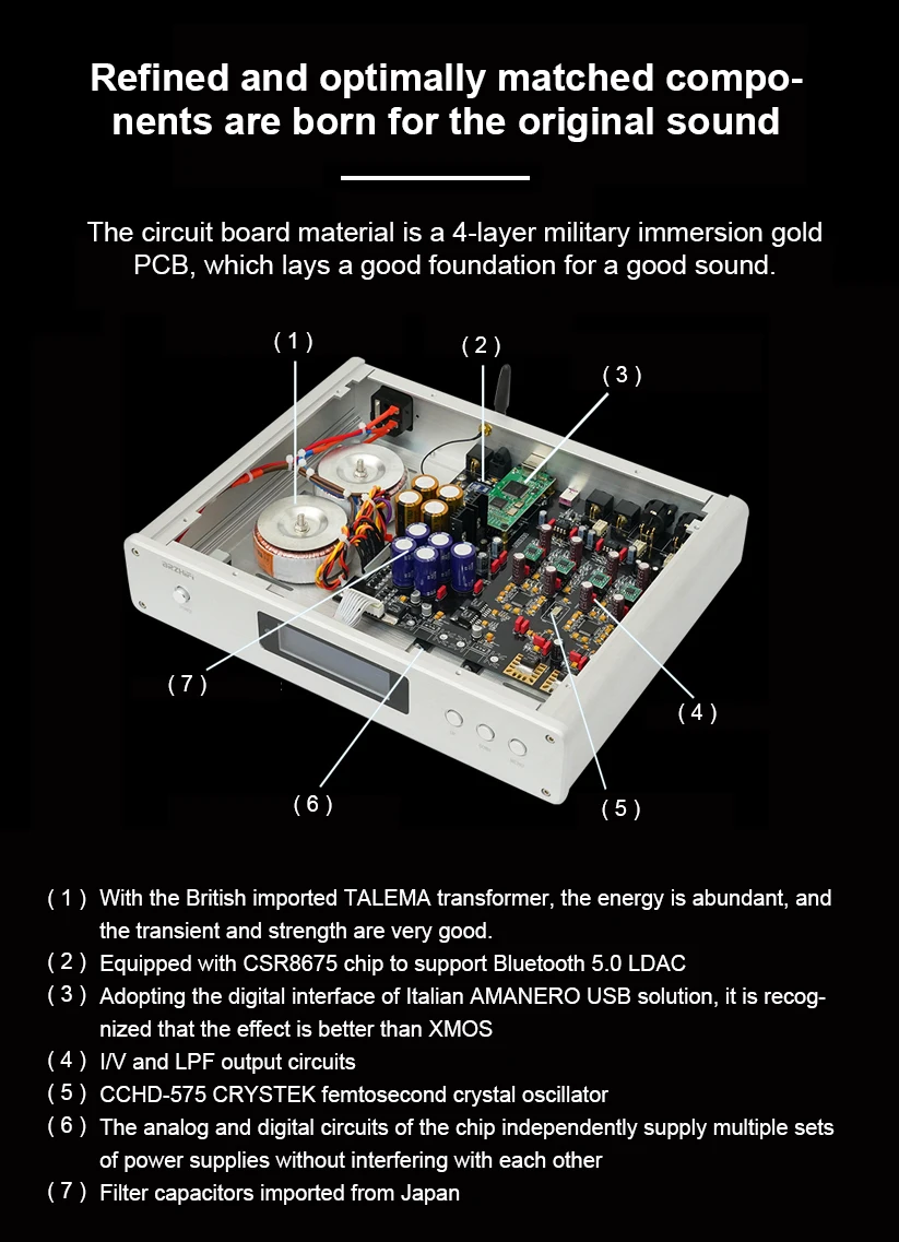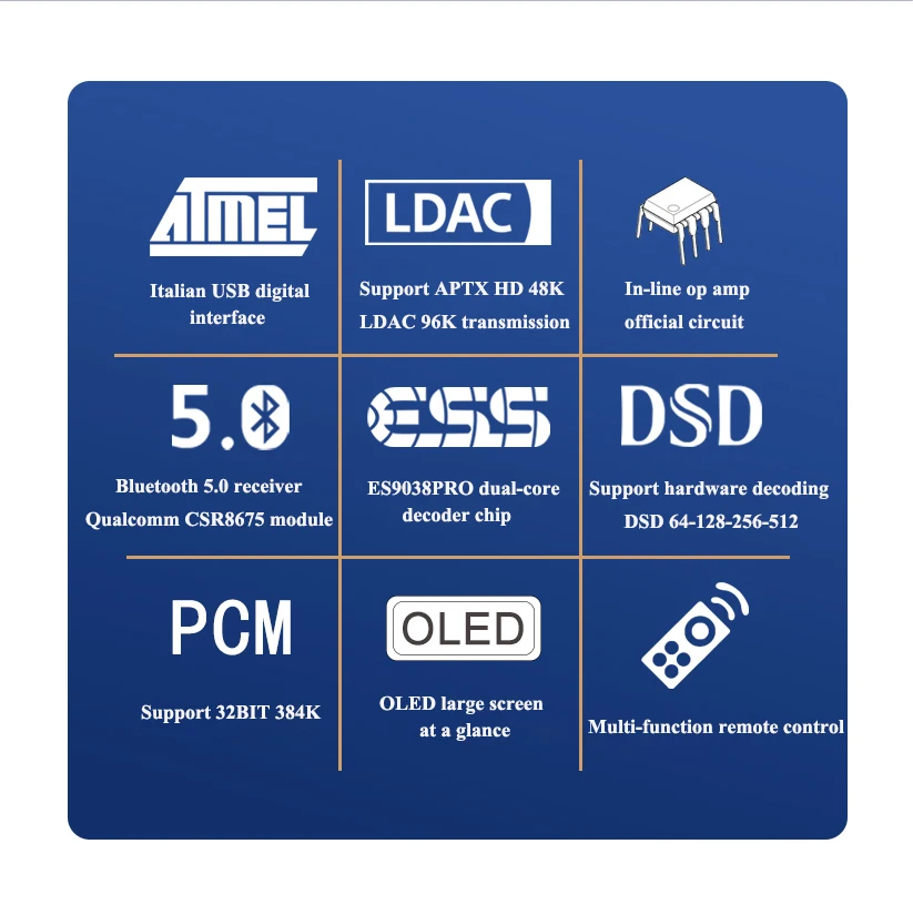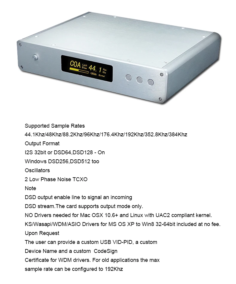 Информация: http://amanero.comЗагрузка драйвера: http://amanero.com/drivers.htmМодуль bluetooth CSR8675, поддерживает bluetooth 5,0, поддерживает APTX и APTX-HD, действительно без потерь.Комплектация: Декодер * 1, usb-кабель * 1, пульт дистанционного управления * 1. (Без шнура питания и других сигнальных кабелей)-