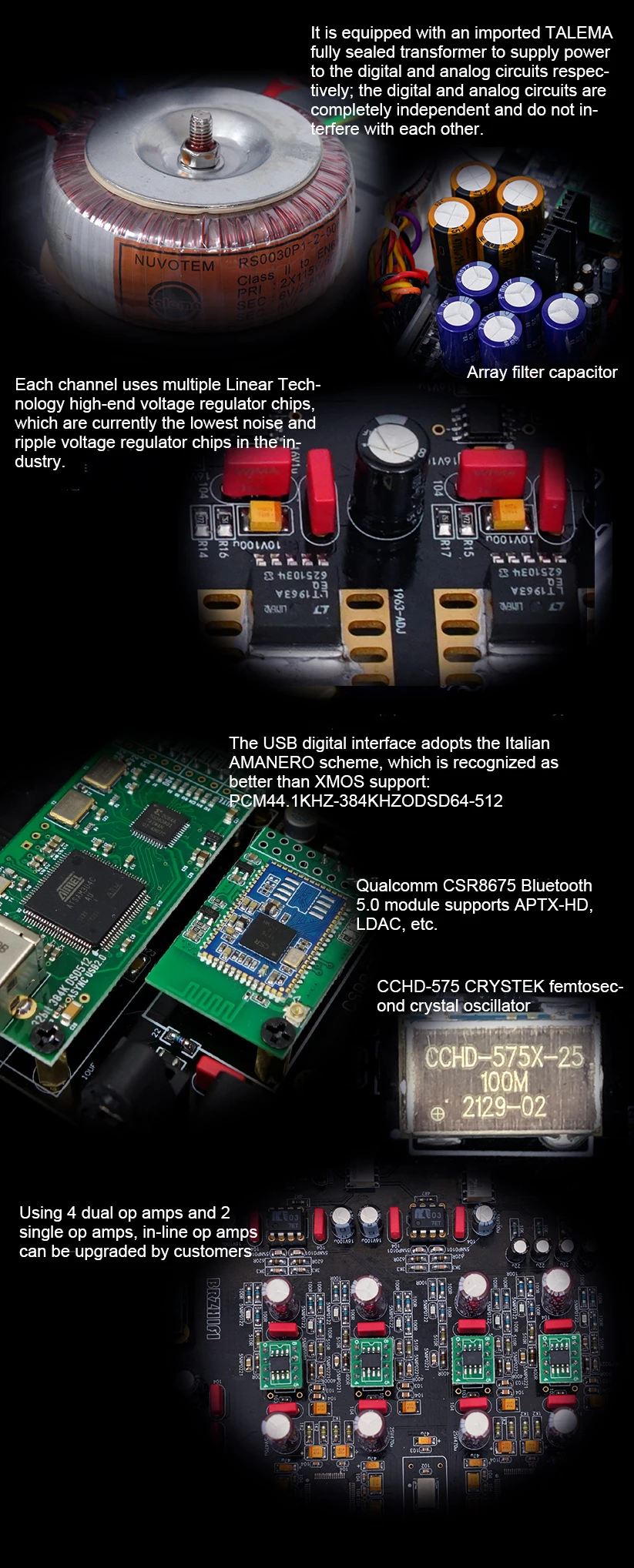 Входной интерфейс: коаксиальный, оптическое волокно, bluetooth, USB-PC/мобильный телефон OTGВыходной интерфейс: сбалансированный интерфейс XLR, интерфейс RCA, 3.5 разъем для наушниковЧип декодирования: ESS ES9038PRO * 2Op Amp: OPA1612 * 4 + LME49710 * 2 / OPA1612 * 4 + Муз * 2Чип усилителя для наушников: TPA6120A2Чип Bluetooth: CSR8675Протокол Bluetooth: 5,0 поддерживает sbc, aac, aptx, aptx-LL, aptx-HDPCM: 44,1 кГц, 48 кГц, 88,2 кГц, 96 кГц, 176,4 кГц, 192 кГц, 352,8 кГц, 384 кГцDSD: DSD64-512 (2,822, 3,072, 5,644, 6,144, 11,2896, 12,288 МГц)Частотная характеристика: 5-25 кГц +-1 дБОбщее гармоническое искажение:-122дбДинамический диапазон: 13 дБОтношение сигнал-шум: 130 дБМощность наушников: 32Ω/7O0mW300 Ω/180mWСопротивление наушников: 16-600ΩНесимметричный Номинальная тепловая мощность: 2,8 VrmsСбалансированный Номинальная тепловая мощность: 5,6 VrmsВся мощность машины: <= 15 ВтРазмер: 316*248*62 ммВес: 5 кг с упаковкойАксессуары: DC300 * 1 пульт дистанционного управления * 1