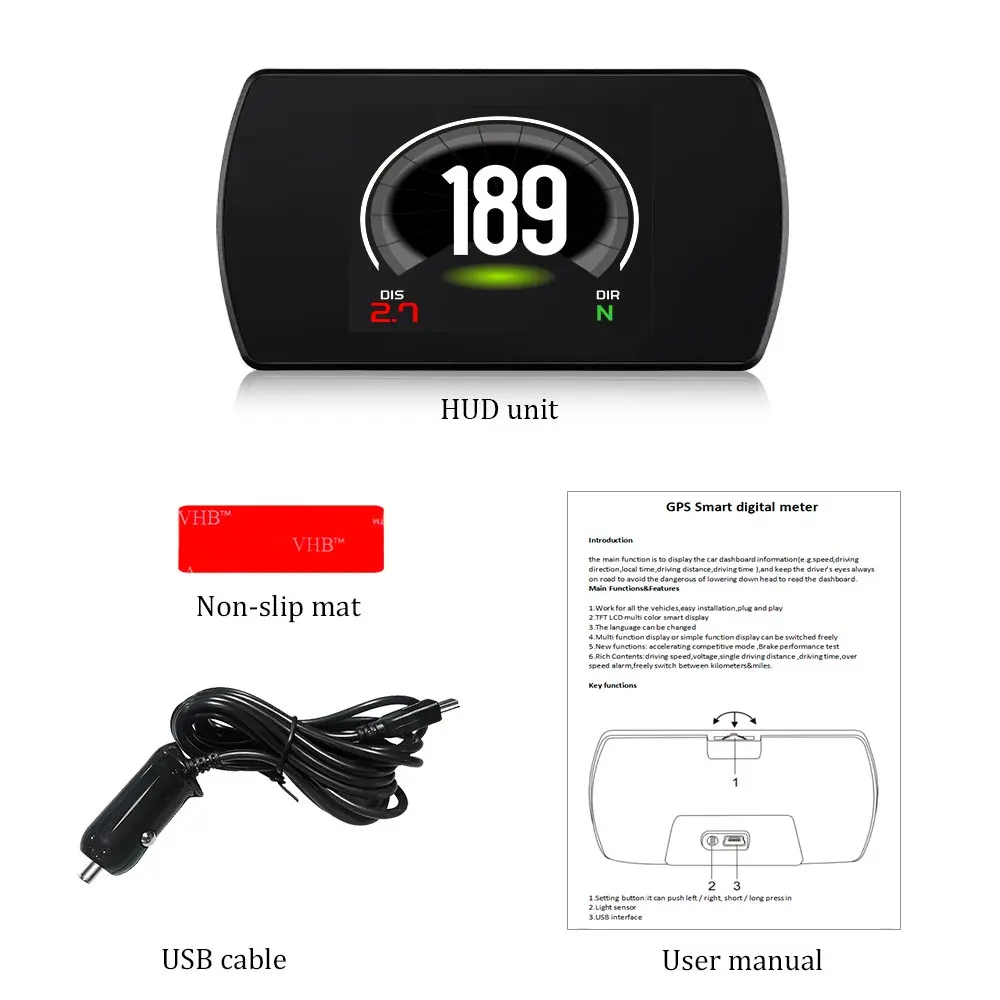 Особенности: 1. Применяйте toall carsin в мире. Подключи и работай. 2.4.3 ”экран и дисплей высокой четкости. 3. Многоцветная конструкция делает экран более насыщенным и легче читать. 4. Использование нано-технологии для устранения нежелательных отражений и может сделать отображение информации более точным. 5. Отображение богатого содержания: скорость, направление движения, время вождения, расстояние вождения, реальное время, номер спутника, высота, сигнализация скорости, свободное переключение между километром и милей. 6. Автоматическое включение и выключение с запуском и выключением транспортного средства, эффективная защита автомобильного аккумулятора; Сохраняя режим ручного переключения, и более легко управлять HUD. 7. Автоматический и ручной режим регулировки яркости, вождение без бликов.