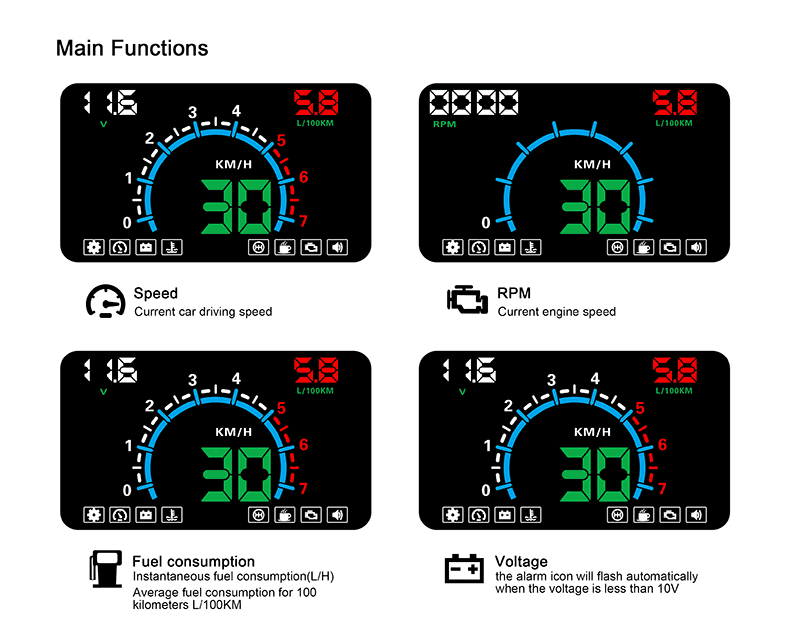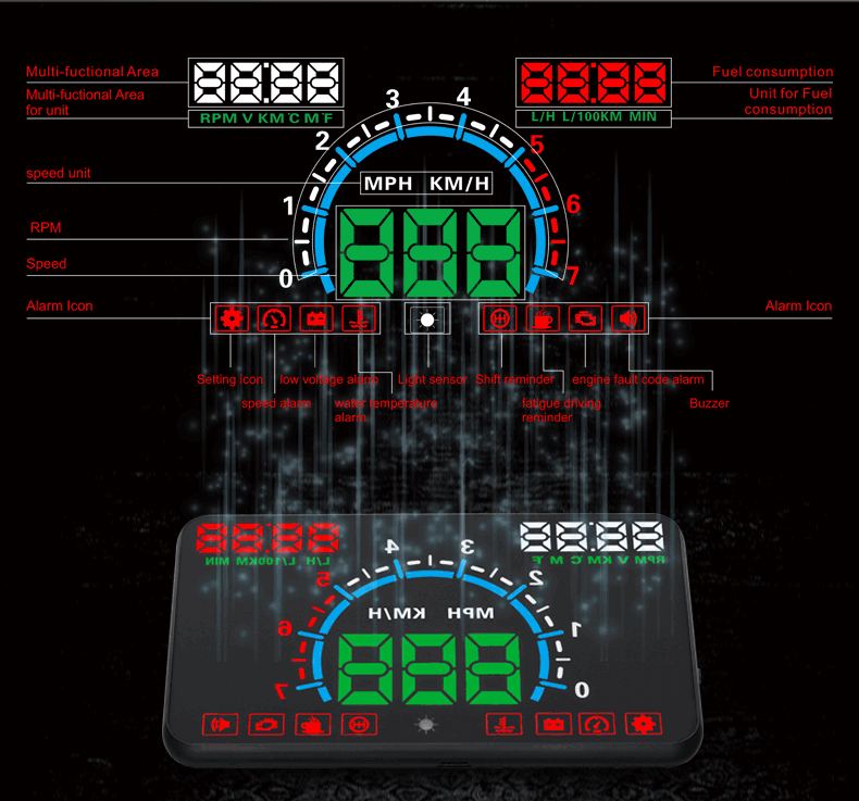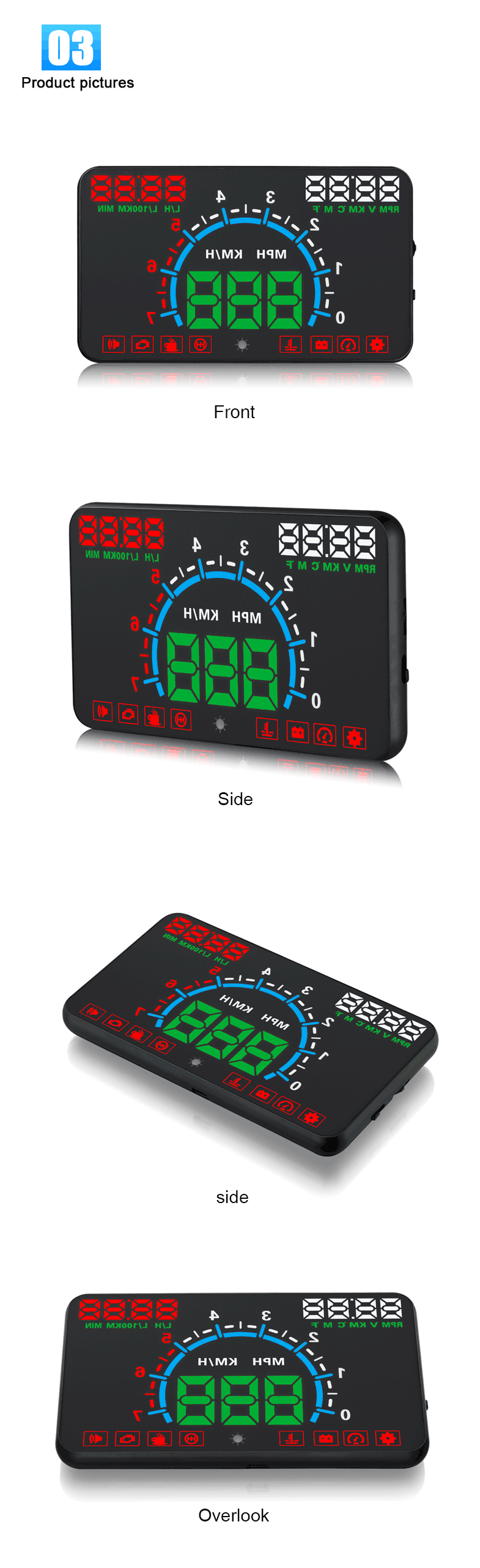 Особенности: 1. Подключи и играй подключение с любым OBDII или EUOBD способным транспортным средством; 2. 2D визуальный эффект 3. 5,8 "экран 4. Многоцветная конструкция облегчает чтение на экране важных деталей для быстрого просмотра; 5. Использование нанотехнологий для устранения нежелательных отражений облегчает Чтение информации; 6. Возможность отображения огромного диапазона статистики автомобилей, включая: скорость, скорость вращения двигателя, температуру воды, напряжение батареи, мгновенное потребление топлива, среднее потребление топлива, местное время, время одиночного вождения, измерение пробега, напоминание о смене, напоминание об утомленном драйвере, Сигнализация низкого напряжения, высокотемпературная сигнализация, сигнализация скорости, сигнализация о неисправности двигателя, Устранение кода неисправности, возможность изменения единиц, например, километр/миля 7. Автоматическое включение и выключение с транспортным средством 8. Автоматический и ручной режим регулировки яркости Установка: