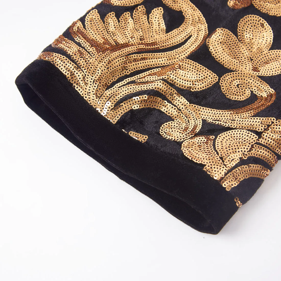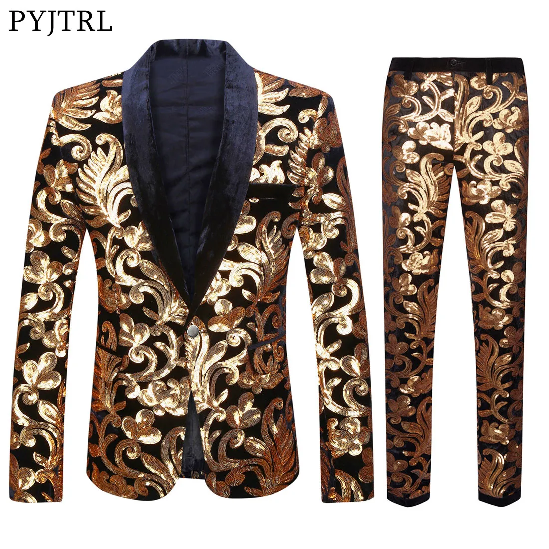 Мужской костюм PYJTRL с отложным воротником, два фото, с брюками, блестками, бархатный блейзер, черный, золотой, блестящий костюм с цветами, куртка, костюм диджея, певицы