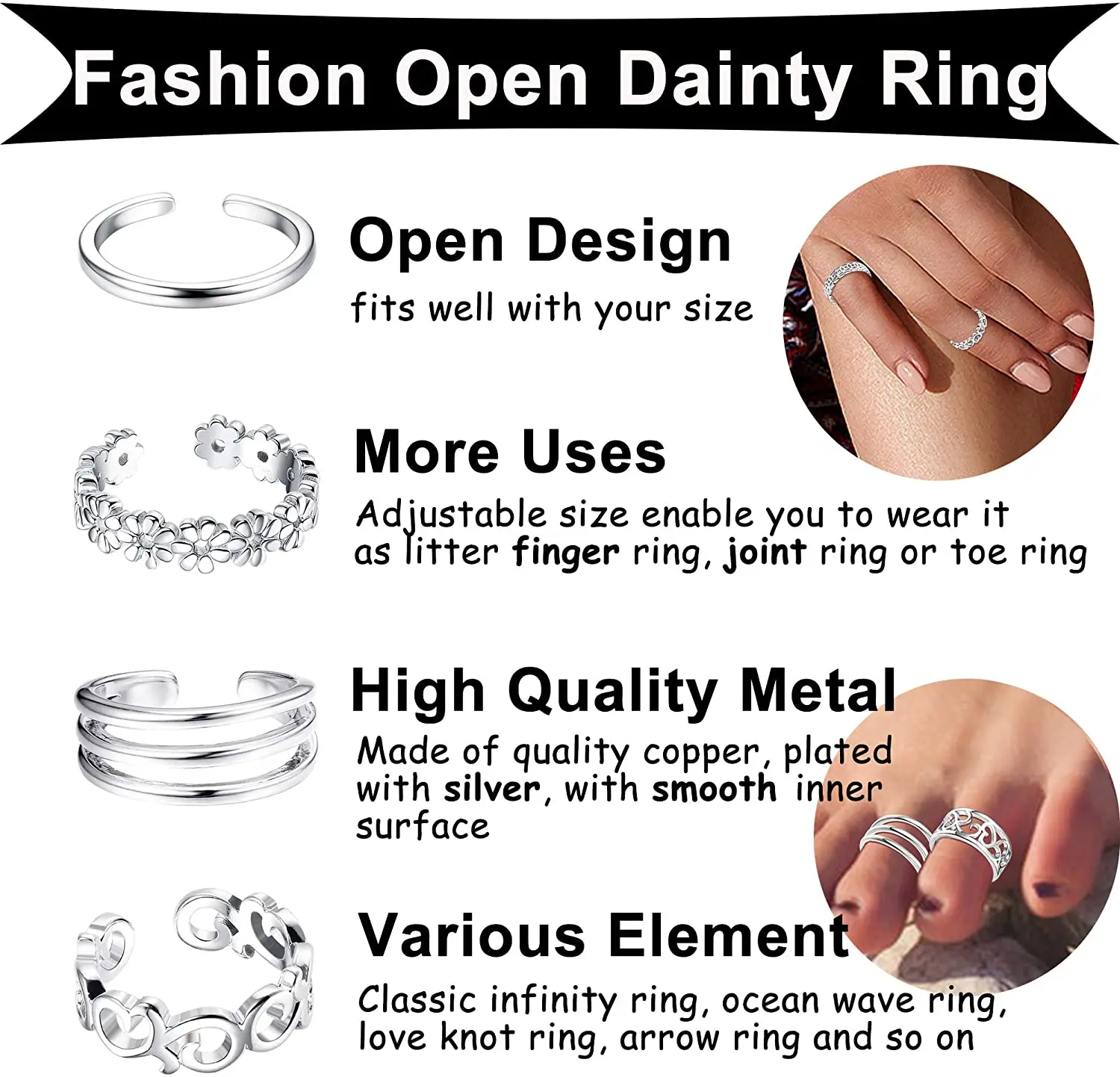 Кольцо женское регулируемое из нержавеющей стали, 6 шт.