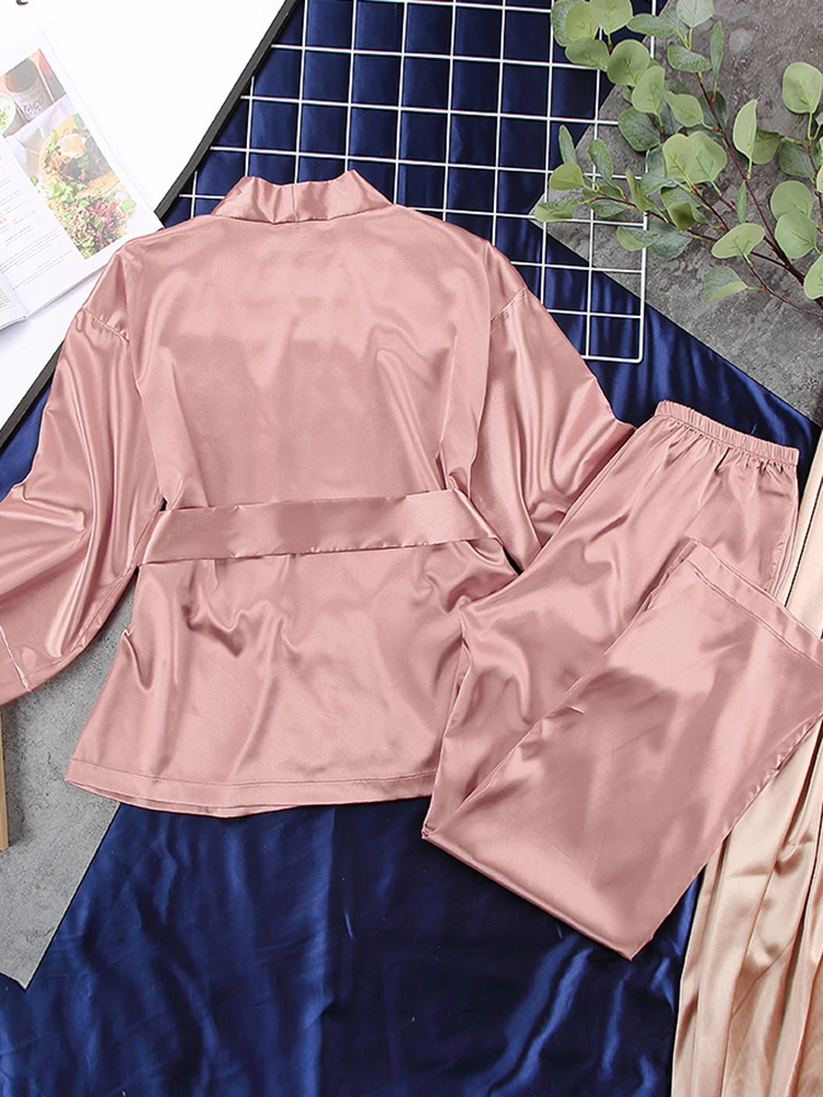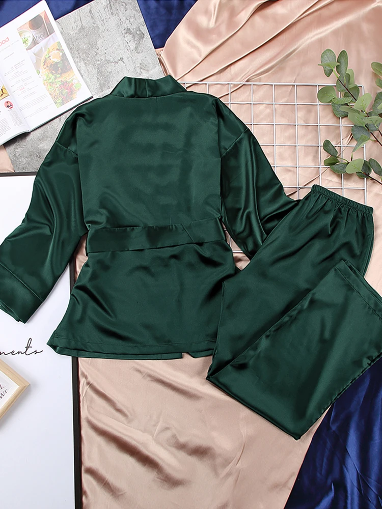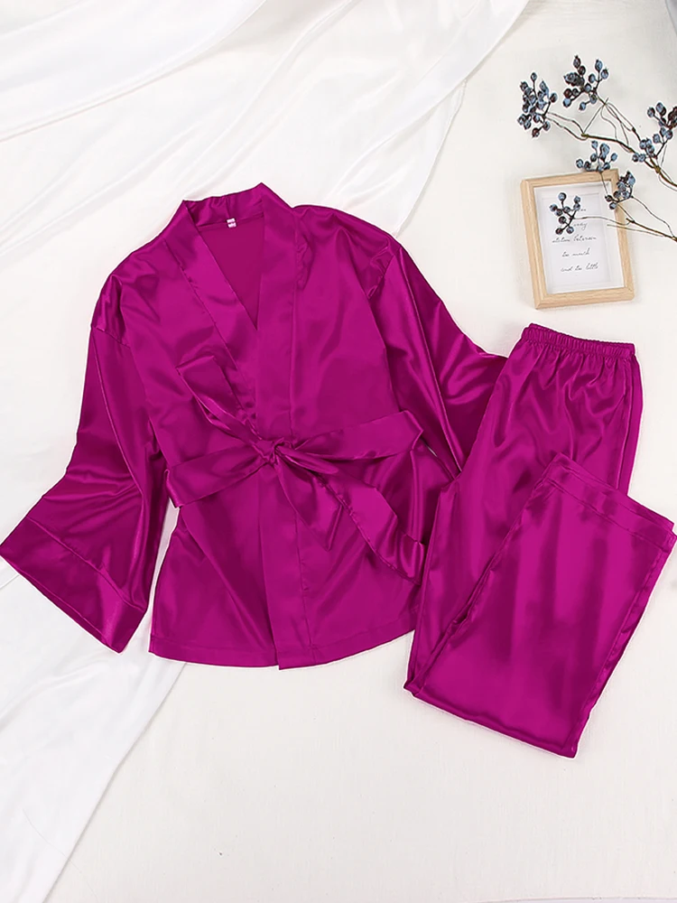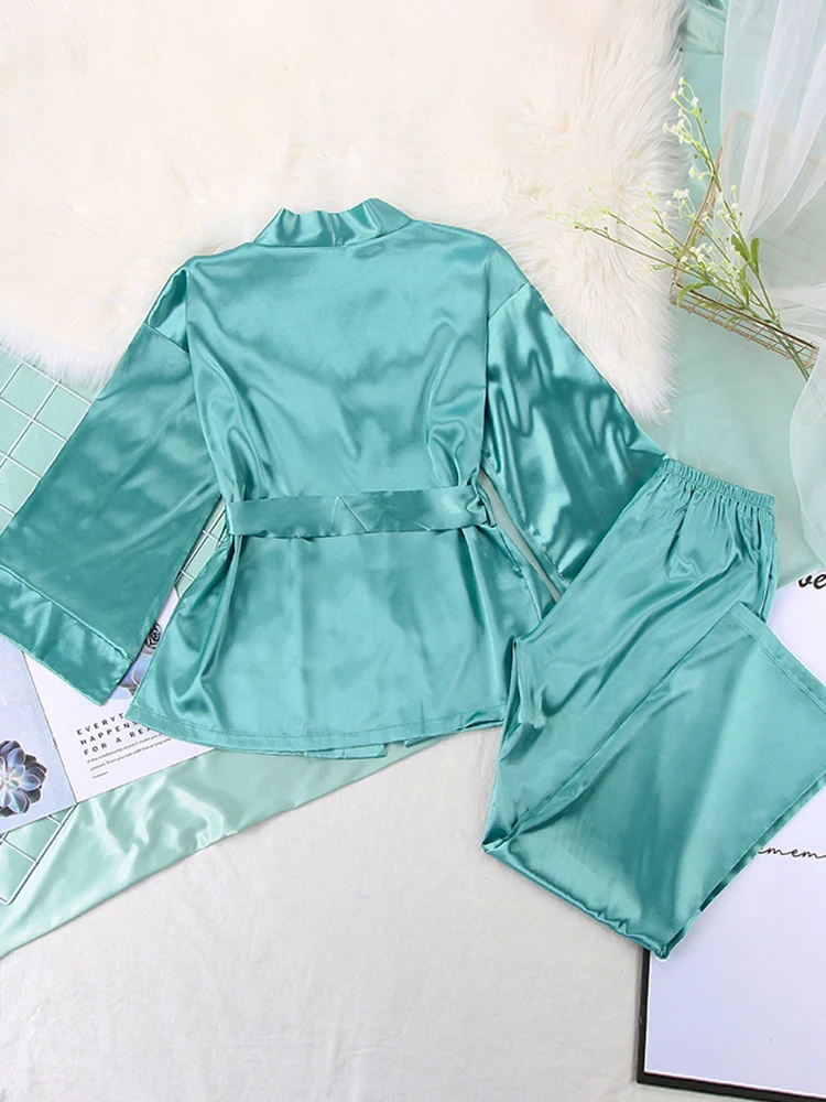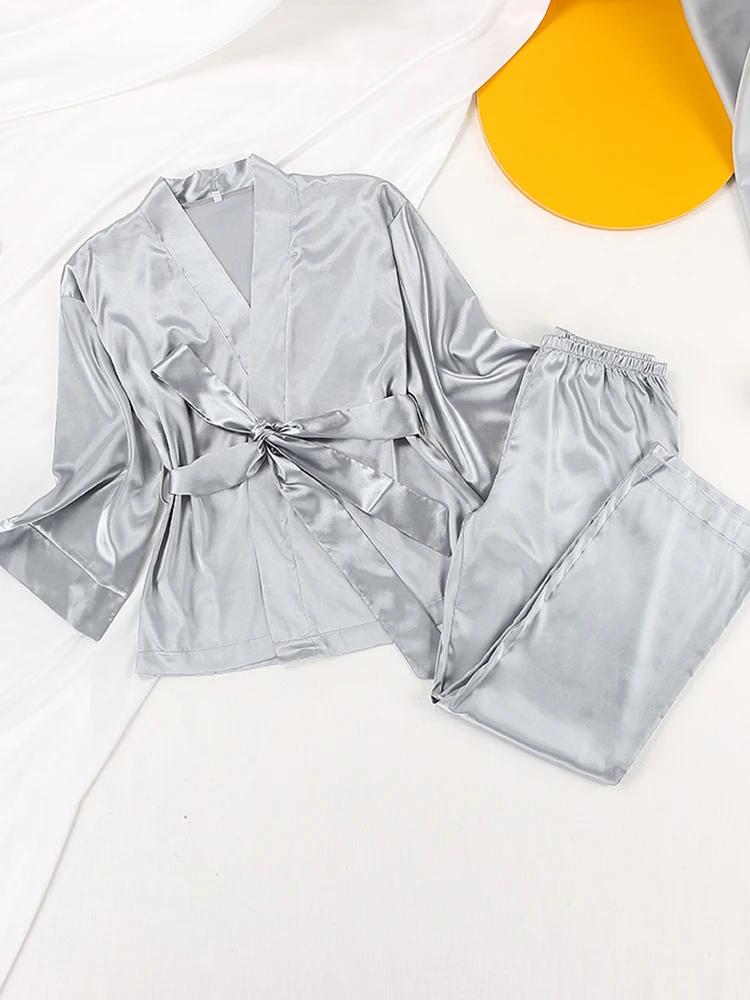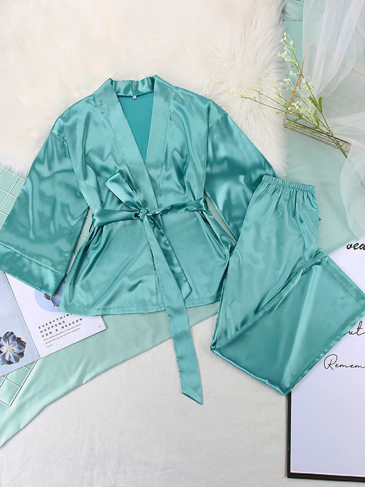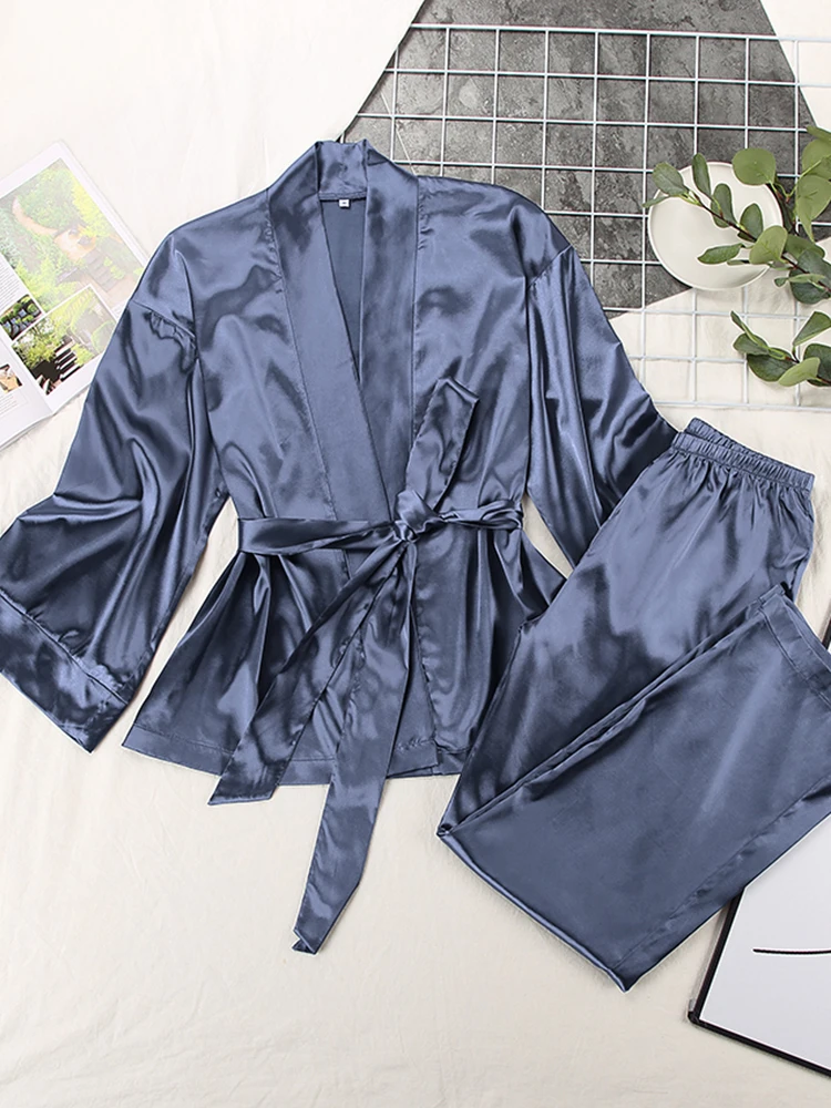 Однотонная Пижама, свободные расклешенные домашние брюки, комплект атласного халата с рукавом три четверти, женский халат, модная весенняя Пижама 2021