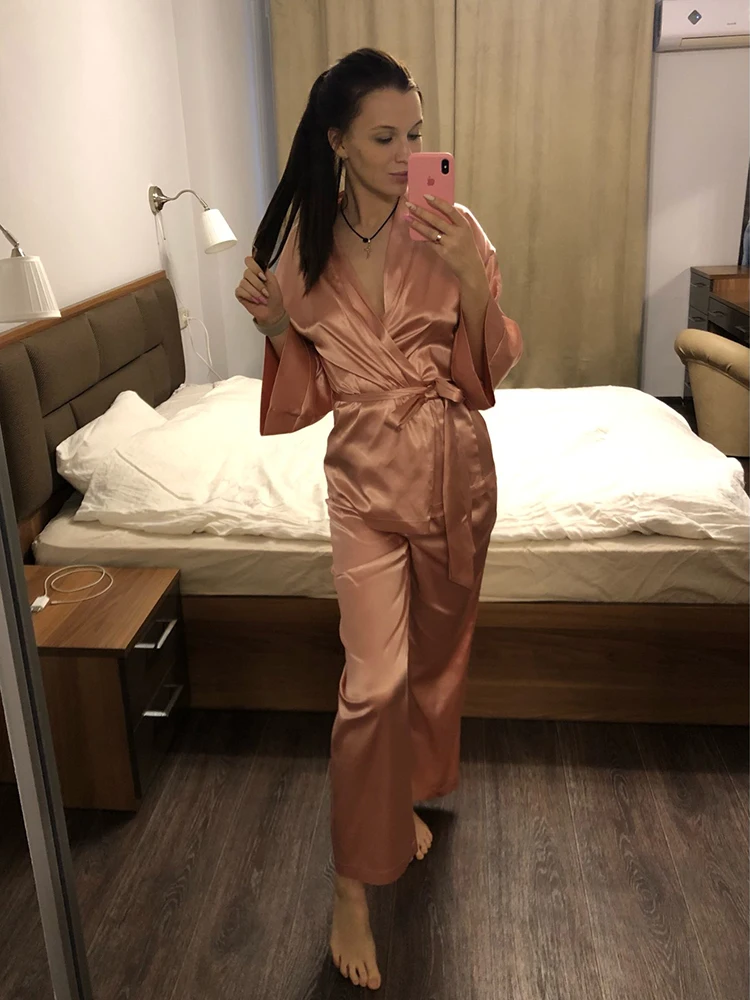 Пижама женская атласная, с рукавом три четверти, однотонная, весна,...