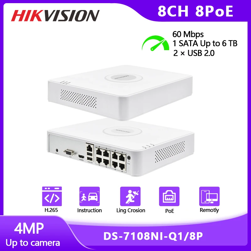 DS-7108NI-Q1/8P> 8-канальный мини 1U 8 PoE NVR> Можно подключить ip-камеры до 8 каналов> Поддерживает декодирование H.265 +/H.265/H.264 +/H.264 видео форматов> До 6 МП высокого разрешения просмотр в реальном времени, хранение и воспроизведение> До 4-ch @ 1080p Емкость декодирования> До 60 Мбит/с Высокая входящая полоса пропускания обеспечивает возможность подключения ip-камер> 1 HDD для непрерывной записи видео> Совместимость с сетевыми камерами третьего Вечерние> Plug & Play с 8 интерфейсами Power-over-Ethernet (PoE).