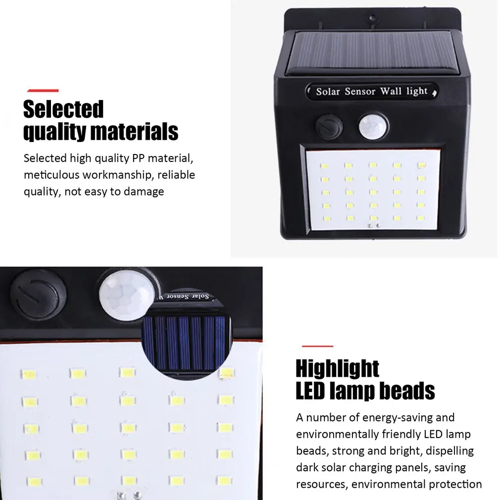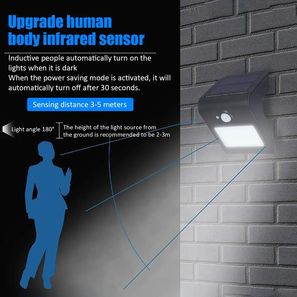 Характеристики:Светодиодный светильник: 30 светодиодныйПанели солнечных батарей: 5,5 V 0,55 WКоэффициент конверсии: 17%Яркость: 350-400LMИндукция: инфракрасный датчикРасстояние чувствительности: 4-5 м/13,1 фута-16,4 футаУгол чувствительности: 120 °Рабочая температура:-10 °-50 ° / 14 °-122 °Тип лампы: 2835(SMD 2835 Светодиодный)Батарея: 18650 литиевая батарея 2200mAВремя зарядки: 8-10 часовВремя освещения: 5 часовПотребляемая мощность: 4 ВтКласс водонепроницаемости: IP 65Чехол Материал: АБС-пластикЦветовая температура: 6000-6500K