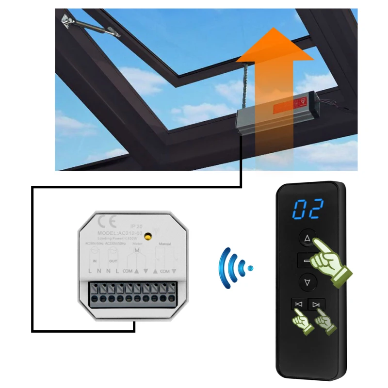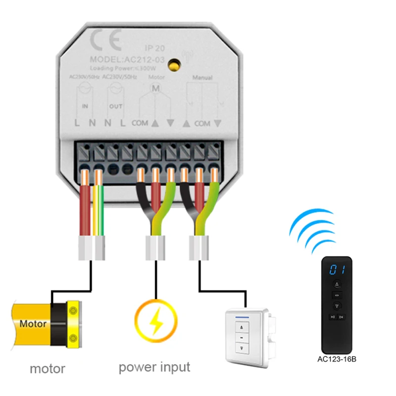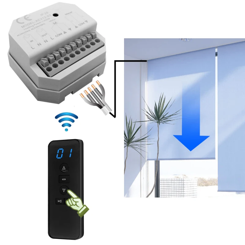 На какой двигатель может быть установлен приёмник AC212: у вашего двигателя должна быть функция остановки влево-вправо или вверх-вниз (например: задвижка затвора, электрический занавес, электрический затвор, электрическая раздвижная дверь, Электрический солнцезащитный козырек и т. д.).