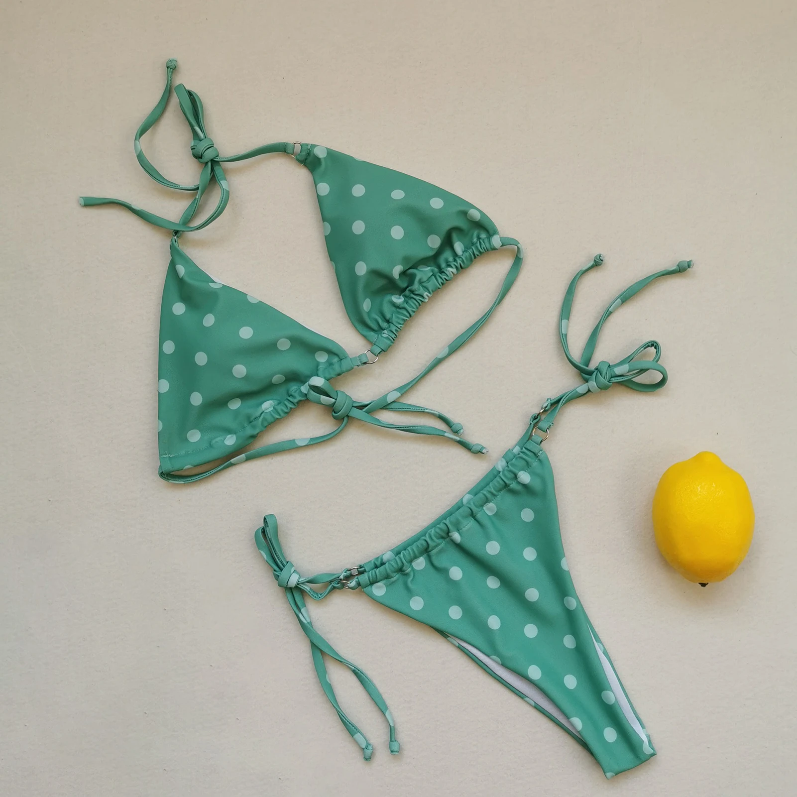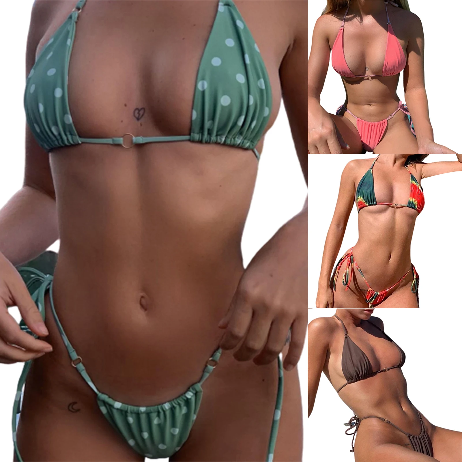Женский комплект бикини, однотонный/с принтом, бандаж, комплект из двух предметов, треугольная чашка, бюстгальтер с лямкой на шее, трусики, купальник на лето
