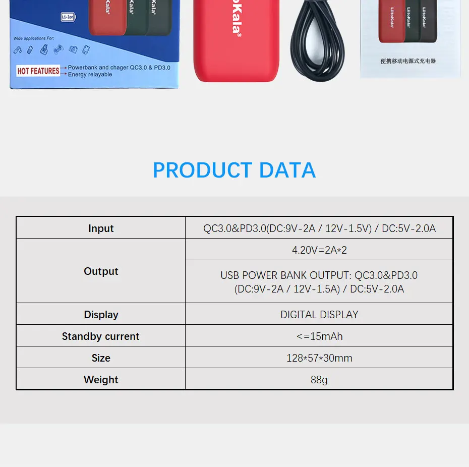 Вход: 5V/2A; 9В/2A, красный/зеленый/синий 12V/1.5AВыход:Аккумулятор DC 4,2 V = 2A * 2; 2A * 1; 1A * 2Внешний аккумулятор USB QC3.0 и PD3.0DC 9V/2A;12V/1,5 V;5V/2AПодходящий аккумулятор: 18650 21700Стандартный набор заказов включает:Lii-MP2 * 1USB кабель * 1Полный набор заказов включает:Lii-MP2 * 1USB кабель * 1Штепсельная Вилка 5 в 2 А * 1Примечание: только применимо к 3,7 в 18650 и 21700 батареи. 18650 PCB применимо, но 21700 PCB не применимо.