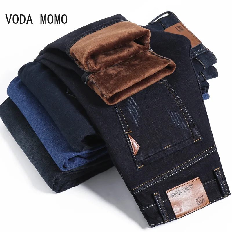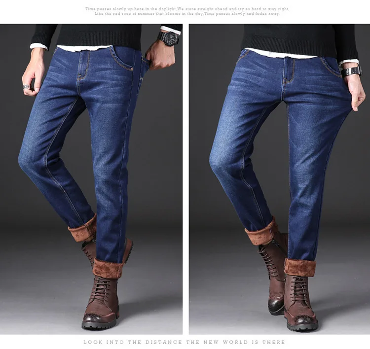 Зимние джинсы, мужские джинсы, черные облегающие эластичные плотные бархатные брюки, теплые джинсы, повседневные флисовые брюки, мужская одежда