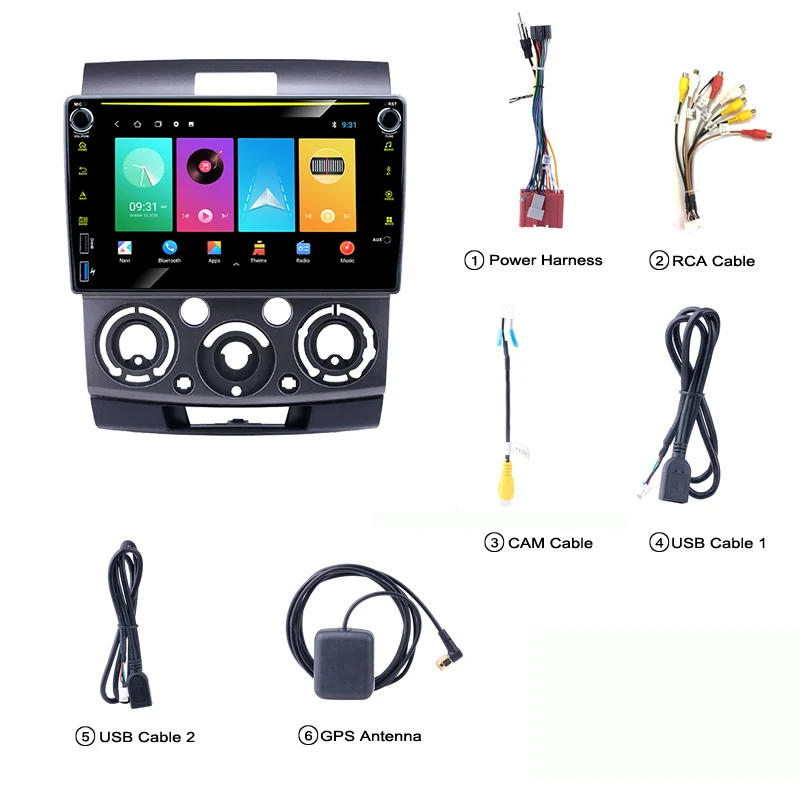 1 x Автомагнитола Ford Everest Ranger и Mazda Android1 x Кабель Питания1 Антенна GPS1 вход для камеры1 вход и выход RCA2 x USB-кабеля1 x Инструкция по эксплуатации