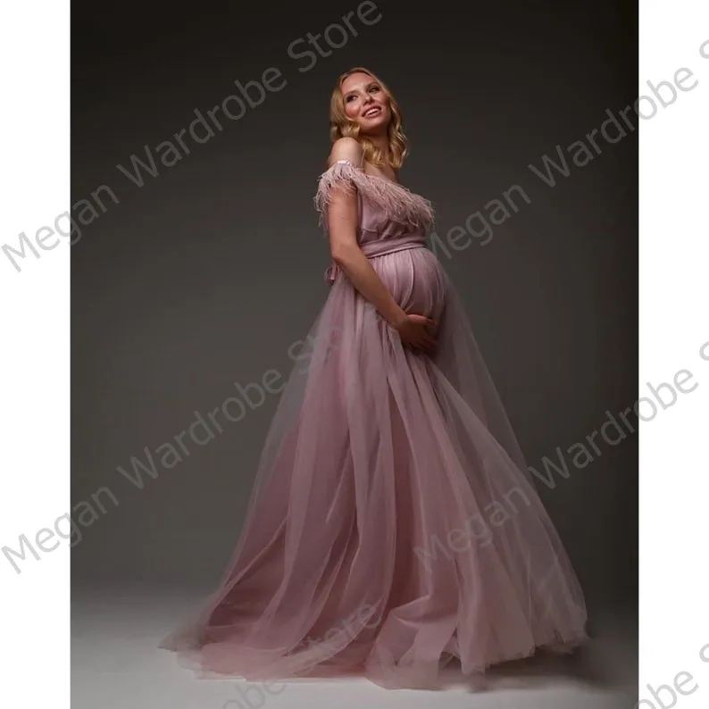 Розовые трапециевидные драпированные платья для беременных женщин без бретелек длинное Повседневное платье с перьями для фотосъемки