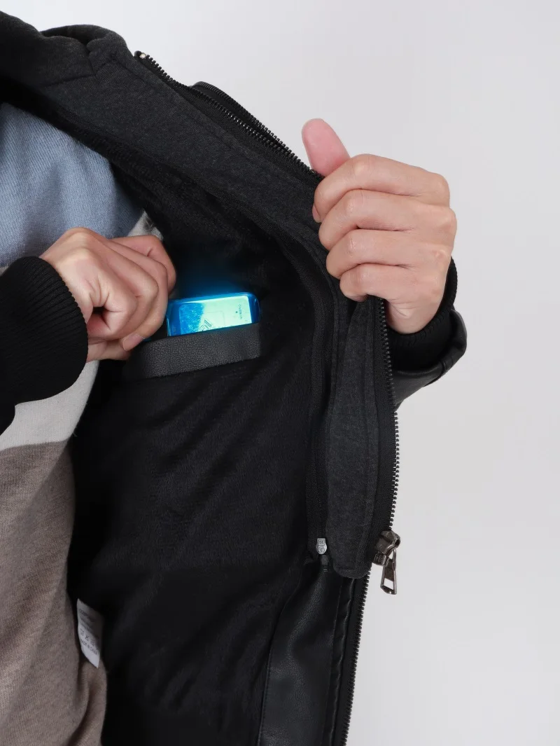 Мужская куртка из искусственной кожи с карманами и капюшоном, осенн...