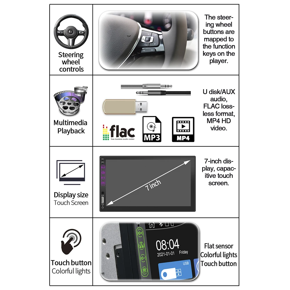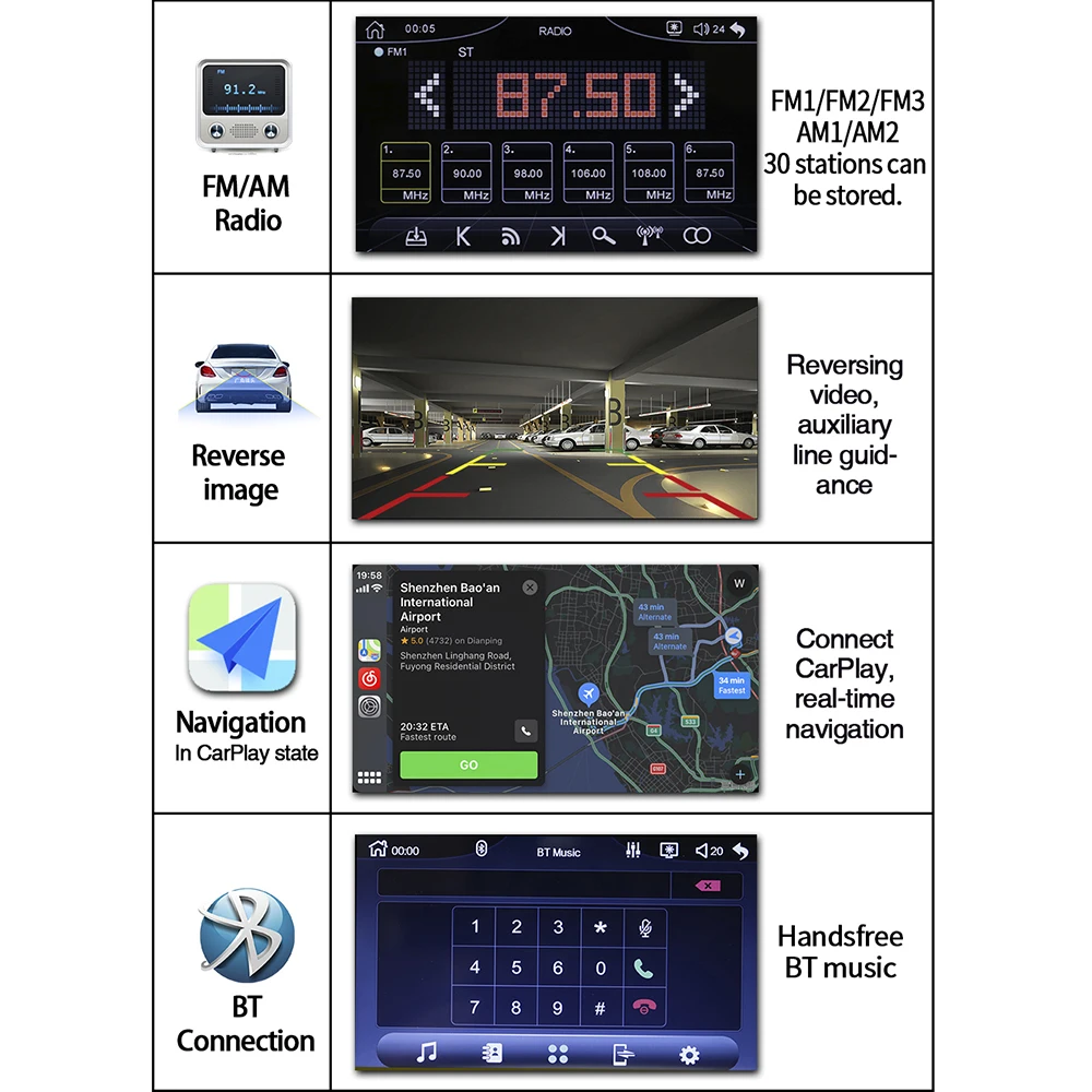 1. Радио2. U-диск (аудио/видео/картинка)3. Входная функция AUX4. Функция Bluetooth5. Аудиовыход RCA может быть подключен к сабвуферу6. Функция заднего вида (камера опционально)7. Видео вход8. Оригинальная функция обучения рулевого колеса автомобиля9. Мобильный телефон, подключение Android AUTO/Apple CarPlay"10. Найдите автомобиль (только для option''BT Find Radio'') через бесплатное приложение.(После парковки телефон может запомнить место парковки и перейти к тому месту, где в то время была парковка)Модель L1Напряжение 12 ВТип автомобиля MP5 плеерСистема Sunplus ecosПолноразмерный сенсорный емкостный экранРаствор 8268KРазмер экрана 7 дюймовРазрешение 1024x600Размер панели 178x103ммПанель освещения красочные огниБлоки FCL 20Giftbox Размер 200x113x170 мм (коробка из воловьей кожи)FCL Размер 595x430x355ммПартии груза на полный контейнер вес 15,5 кгГлубина хоста 65 ммОдин вес 620 гMirrorlink Miirorlink(Android/iPhone); Carplay & Android autoРадио FM/AMРадиочип ZT0811Язык английский/испанский/португальский/упрощенный китайский/традиционный китайский/немецкий/французский/Турецкий/японский/русский/итальянский/Польский/Голландский/Датский/Греческий/израильский Мощность 60 ВтТемпература-10 ~ 60 ℃Поддержка обратного изображения (опция камеры)Поддержка напоминания о тормозеПоддержка управления рулевого колесаВерсия Bluetooth 4,2Чип усилителя CD7388Радиочастота FM 87,5 ~ 108 МГц AM 522 ~ 1620 кГцПоддержка видеовыходаСиликоновый пульт дистанционного управления 21 клавишаПередняя панель USB интерфейса USB2.0Кнопка сбросаКнопка сенсорная кнопкаRCA Терминал 2 аудиовыход, 1 Реверсивный вход, 1 видео вход, 2 видеовыходаВход AUX имеетФормат аудио MP3/WMA/AAC/APE/OGG/M4A/RA/WAVФормат видео "H264 DIVX HD(720P 1080I 1080P)AVI/FLV/MKV/RMVB/MPEG/ASF/TS/H264/QT"Формат изображения JPEG/PNG/BMP/GIF/TIFFХост-лист машины + руководство + шнур питания + пульт дистанционного управленияУпаковочный лист