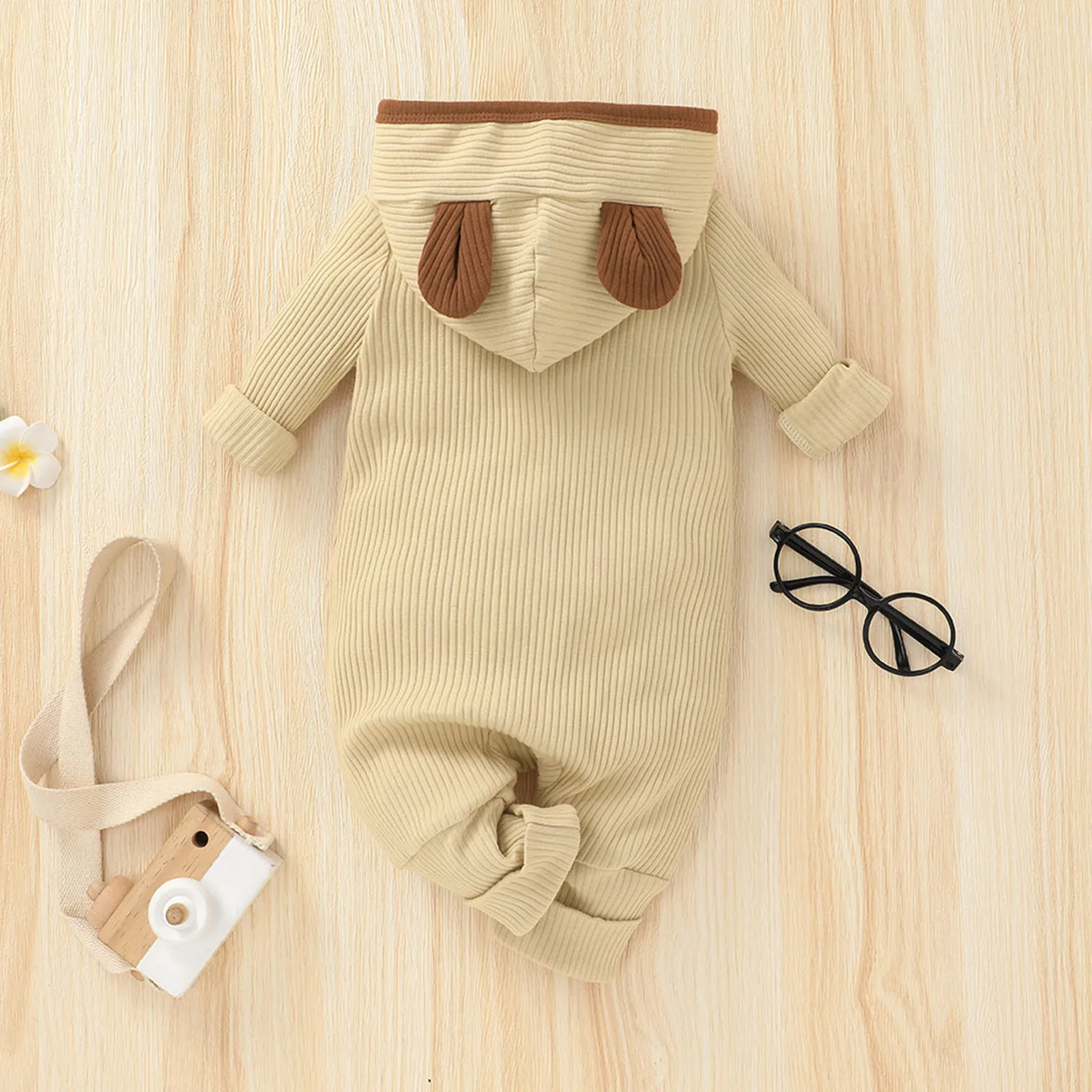Комбинезон в рубчик на пуговицах с капюшоном для новорожденных мальчиков и девочек